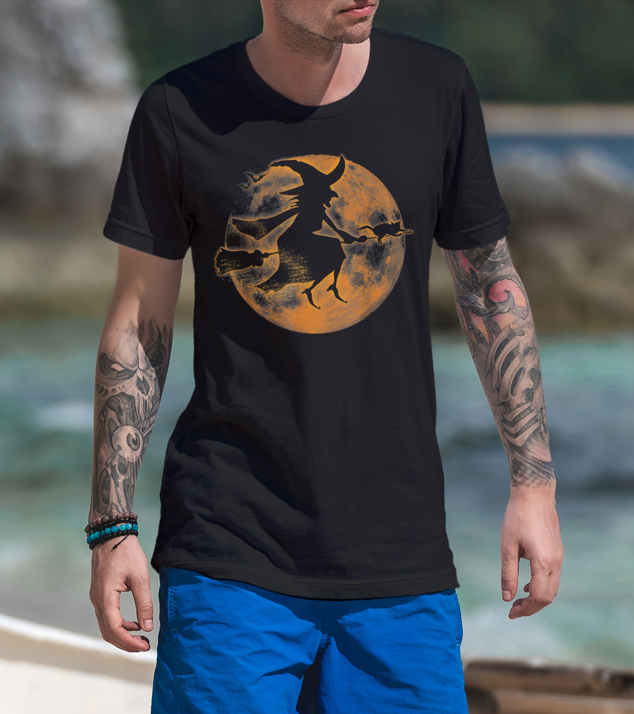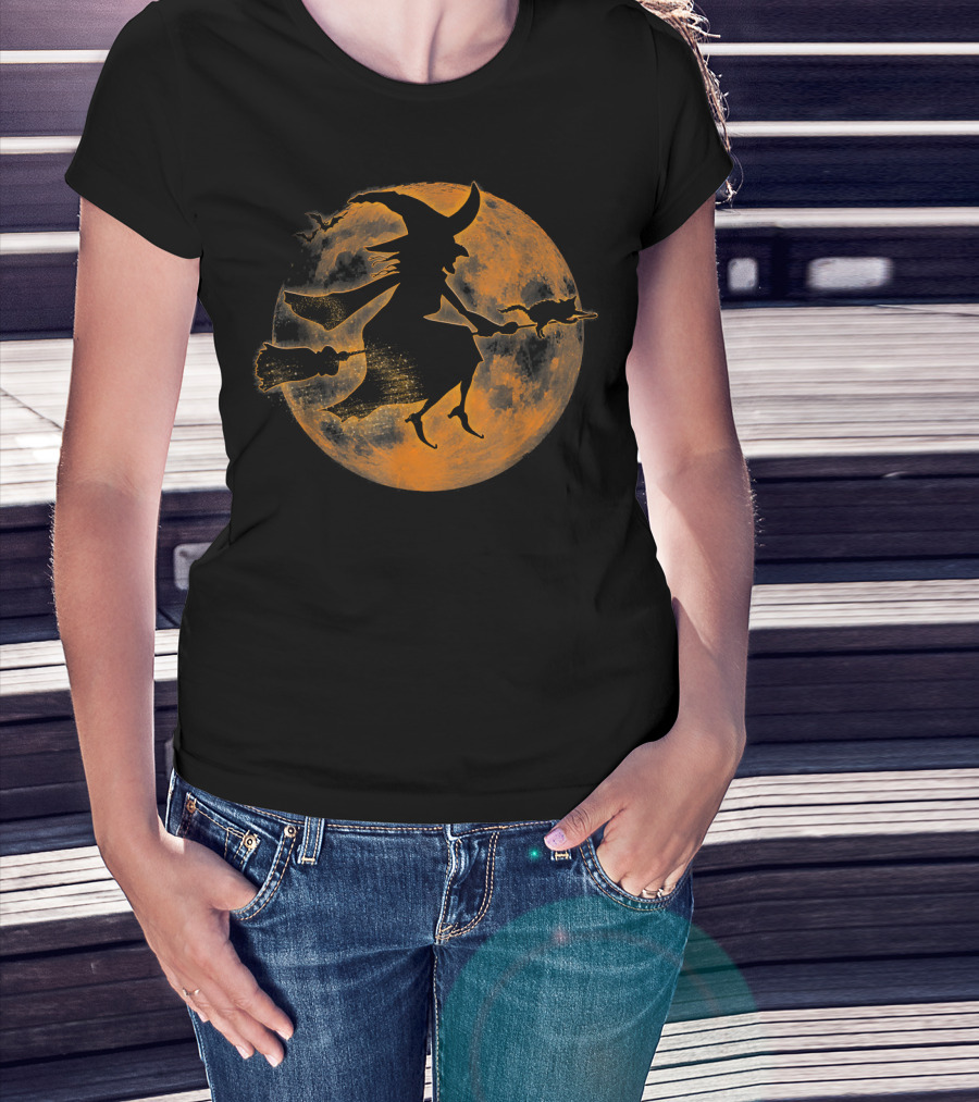The Halloween Spooky Witch and Cat on Broomstick Full Moon Scene T-shirt is designed for everyday wear and a consistent fit. Fabric is pre-shrunk ring-spun cotton with durable stitching. See the size chart below for exact measurements.