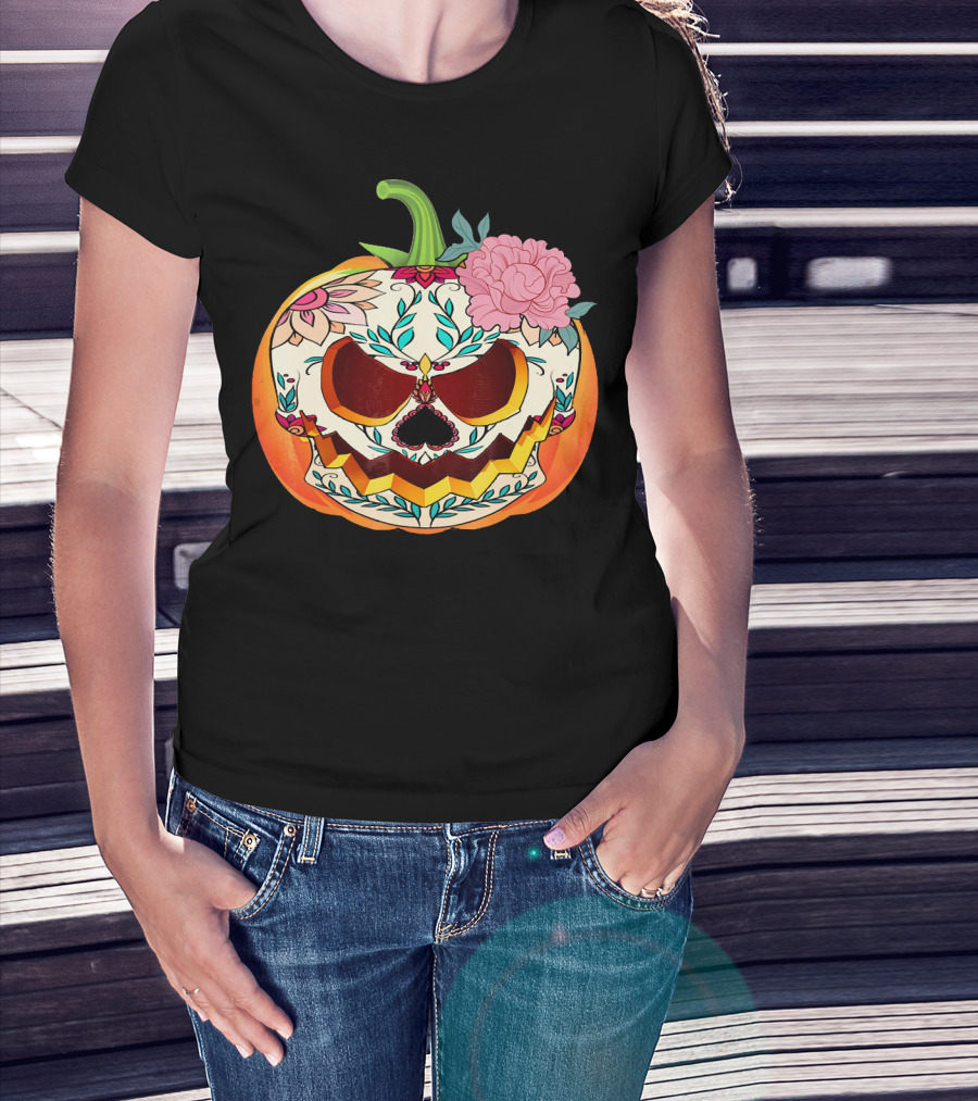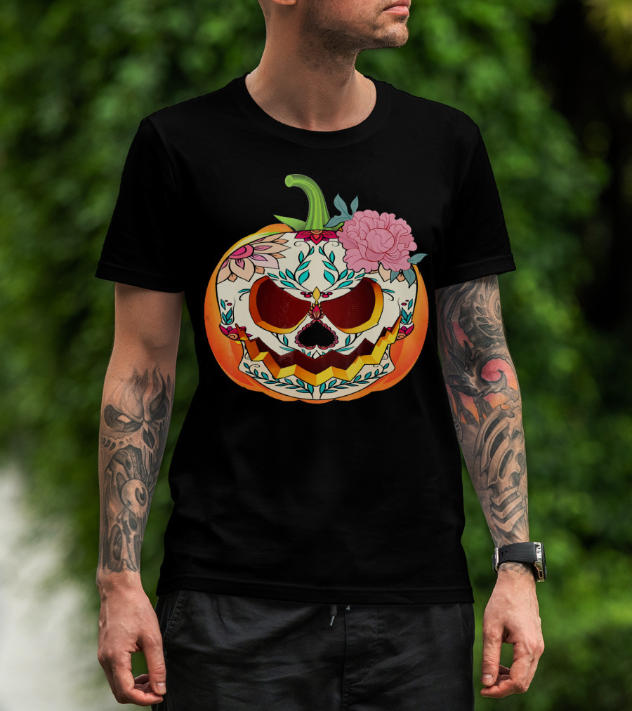 Day Of The Dead Pumpkin Sugar Skull With Floral T-Shirt