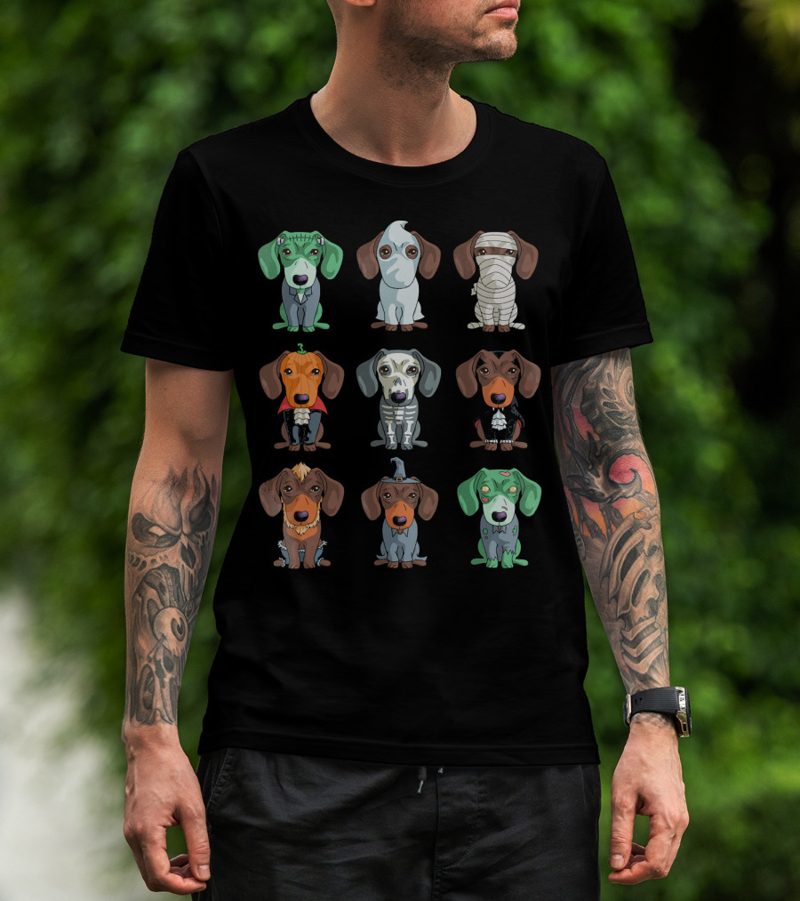 Dachshund Halloween Funny Weiner Frankenstein Ghost Mummy Pumpkin Skeleton Vampire Wizard Zombie Monster T-Shirt