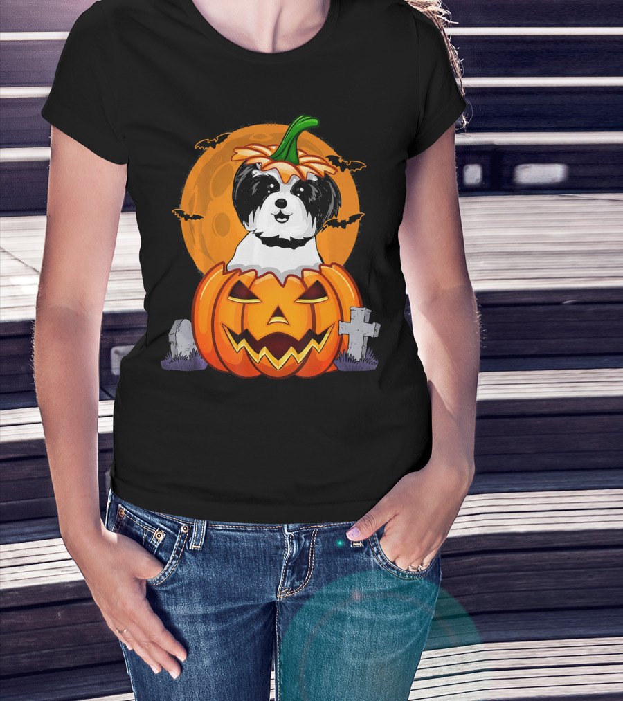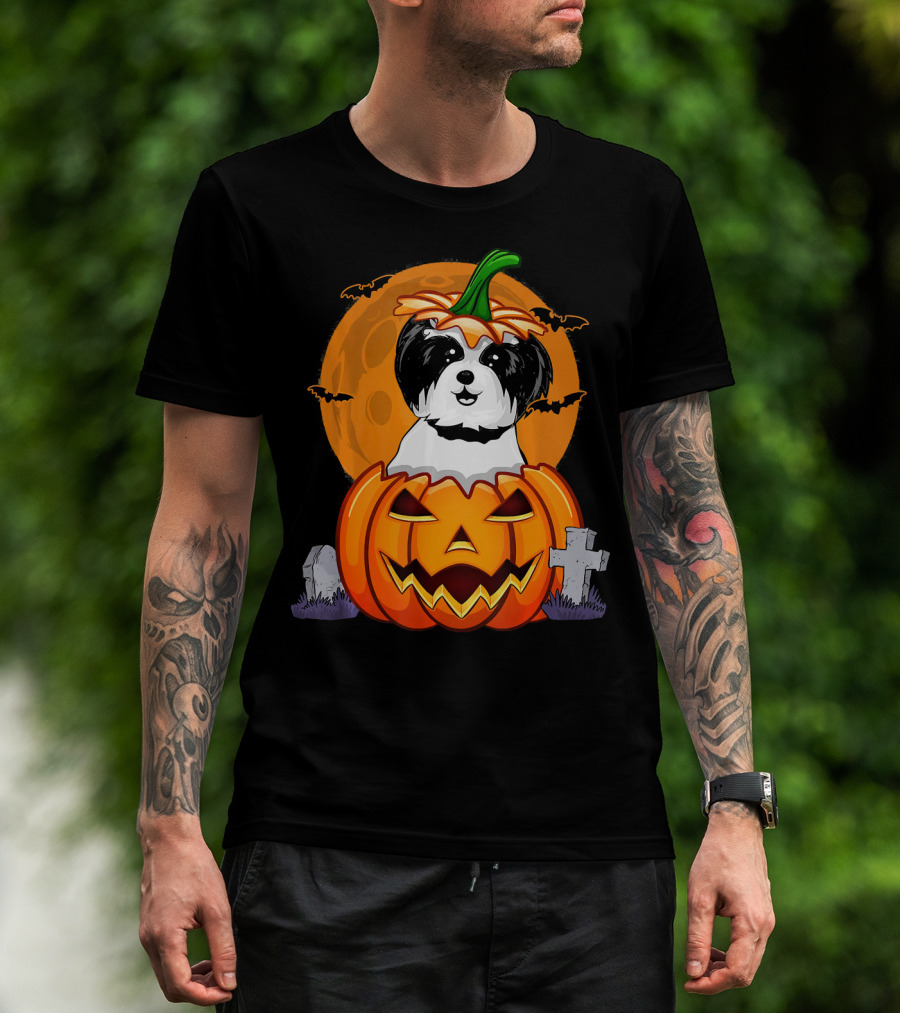 Funny Shih Tzu Pumpkin Halloween Moon Bats Graveyard T-Shirt