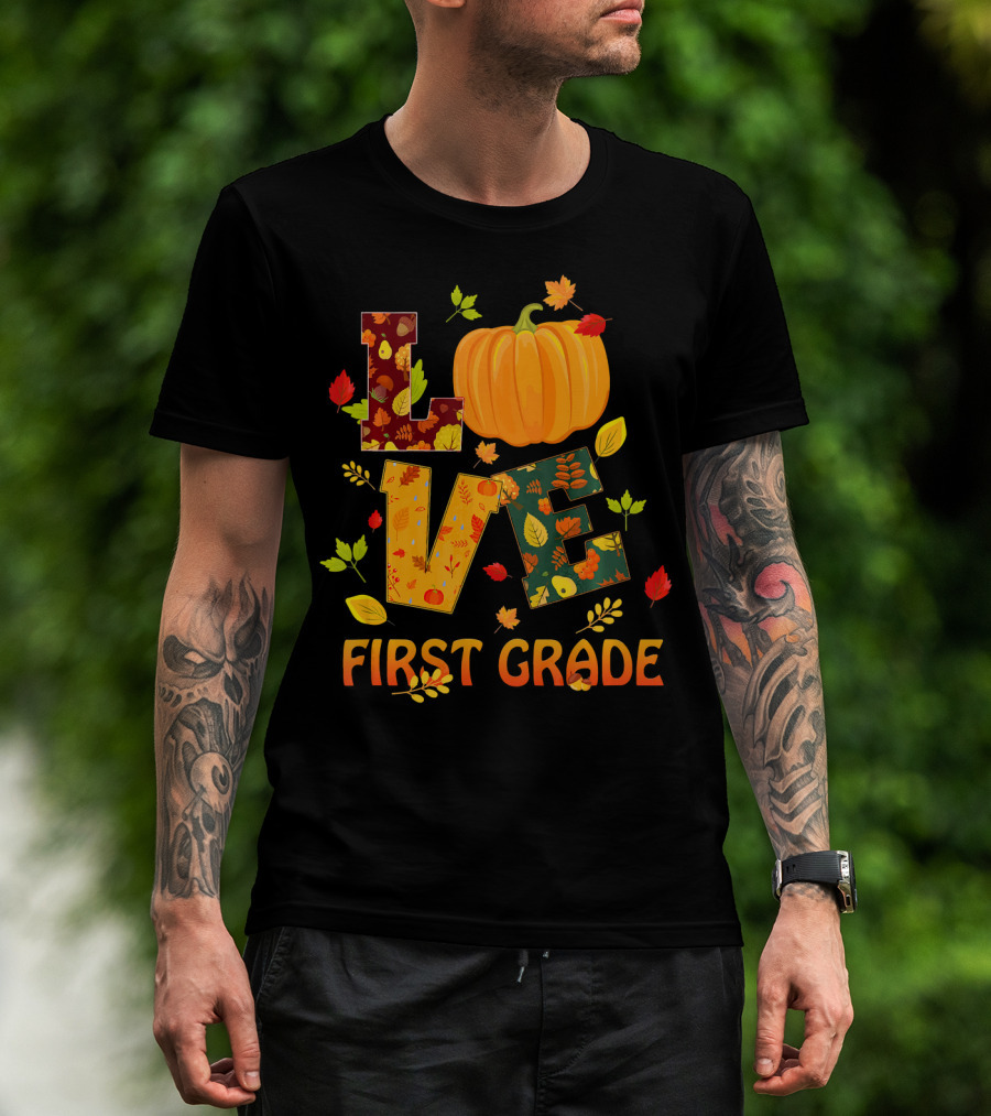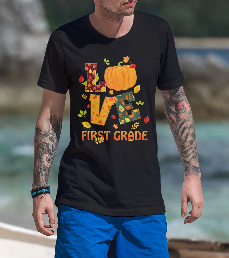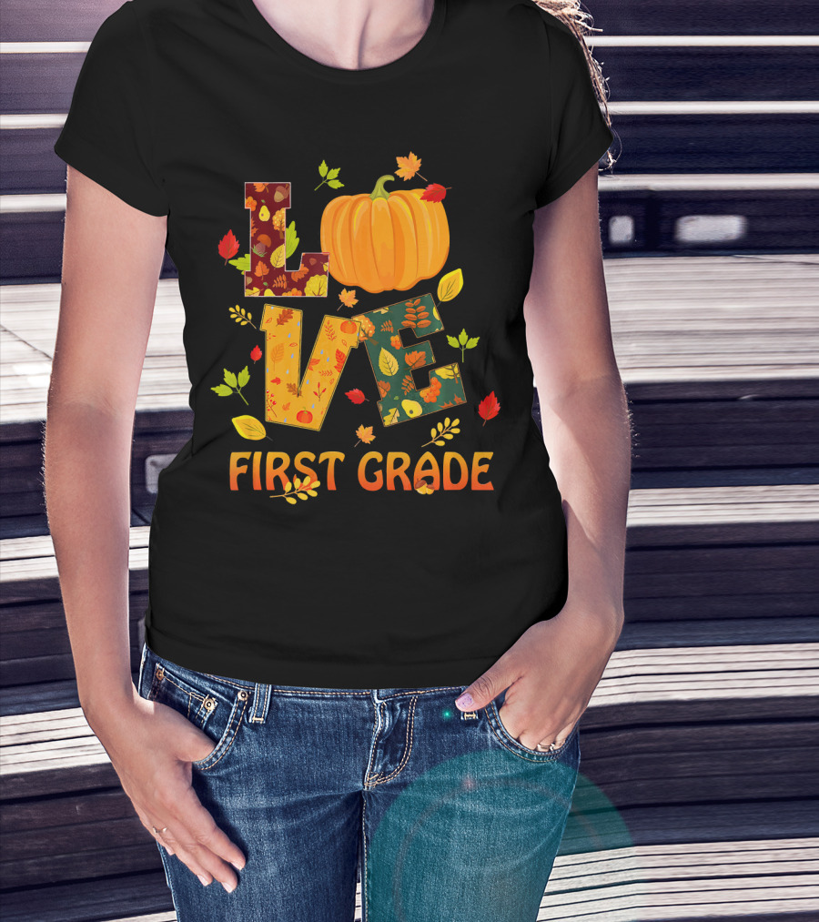 Love First Grade Thanksgiving Pumpkin Leaves T-Shirt