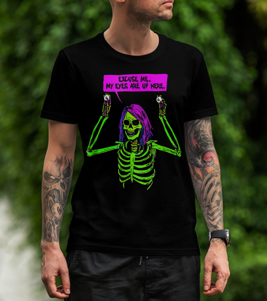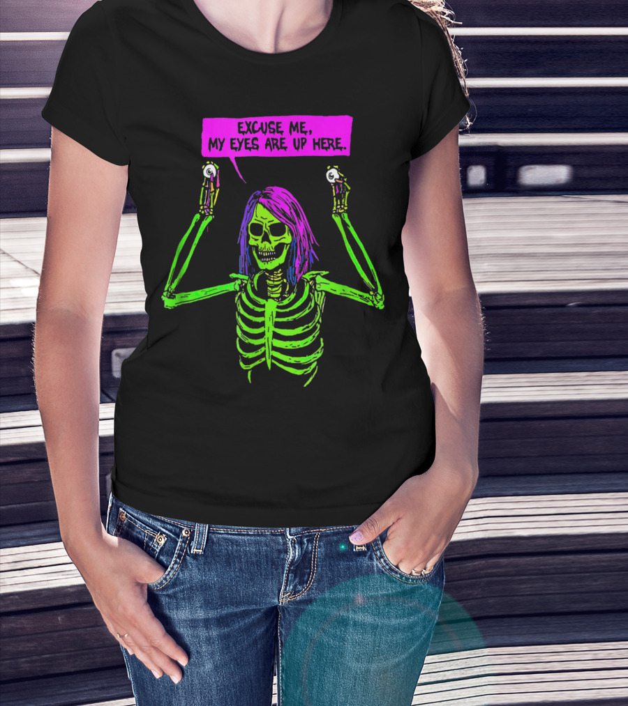 Excuse Me My Eyes Are Up Here Funny Skeleton Neon Green And Purple T-Shirt