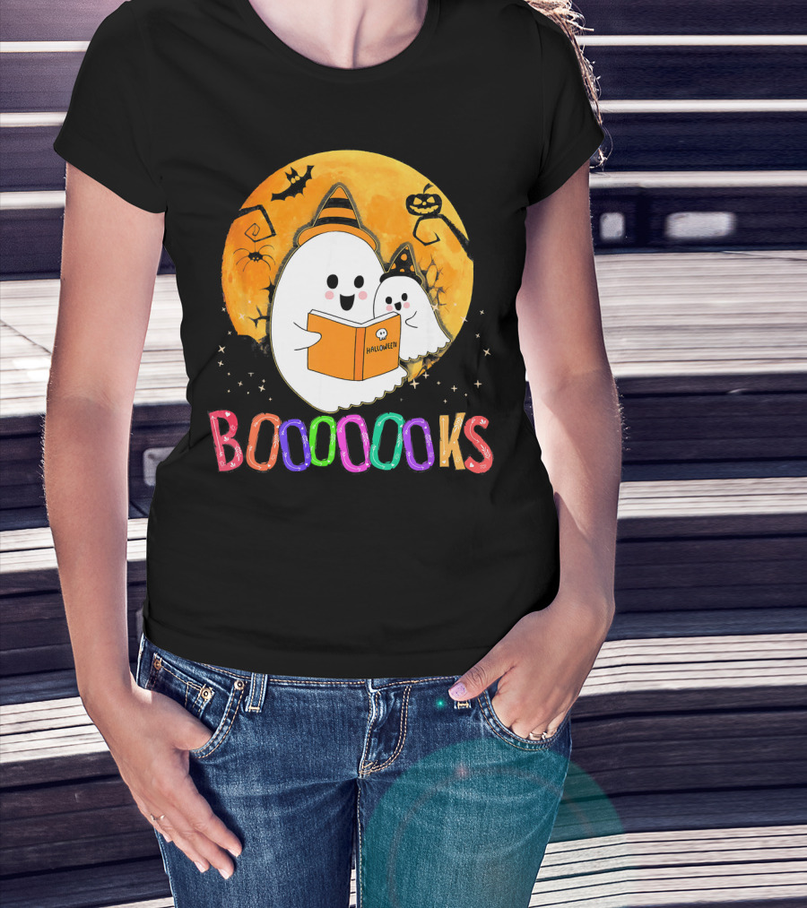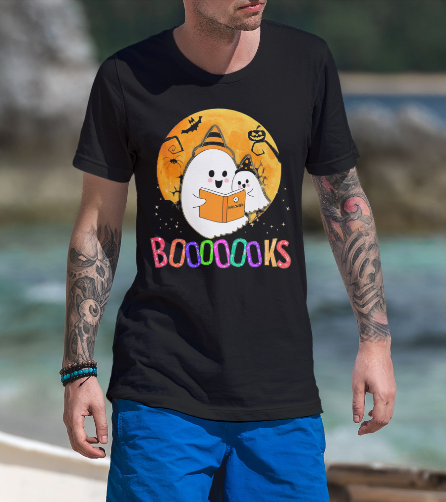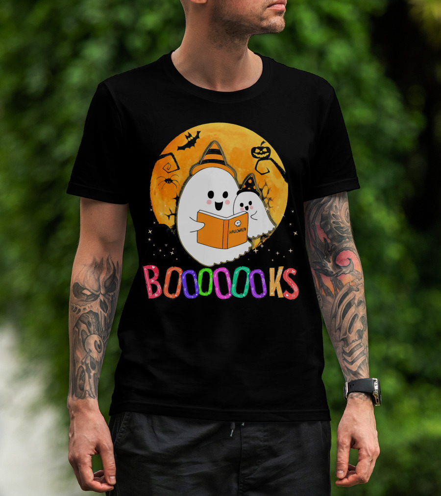 BOOOOOOKS Halloween Ghost Reading Under Full Moon T-Shirt