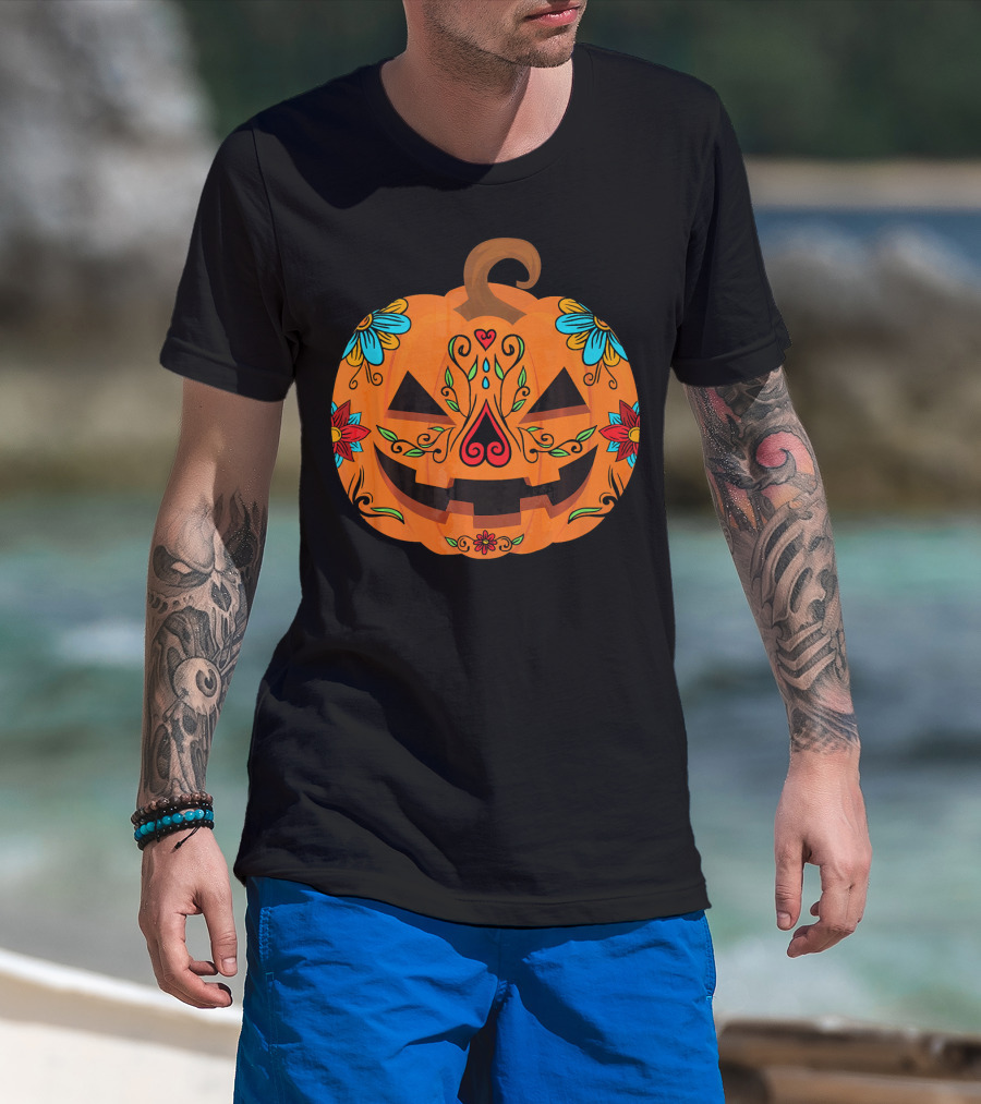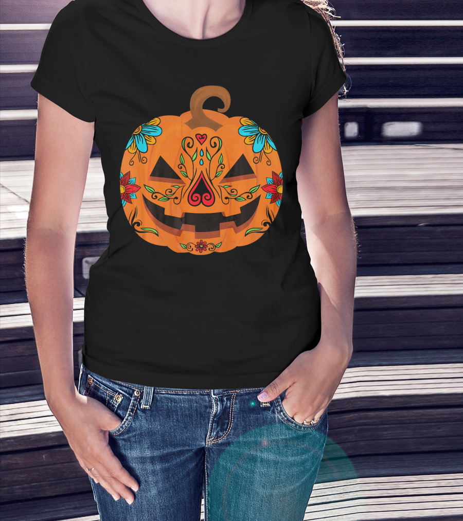 Pumpkin Sugar Skull Halloween Jack-O'-Lantern Floral T-Shirt
