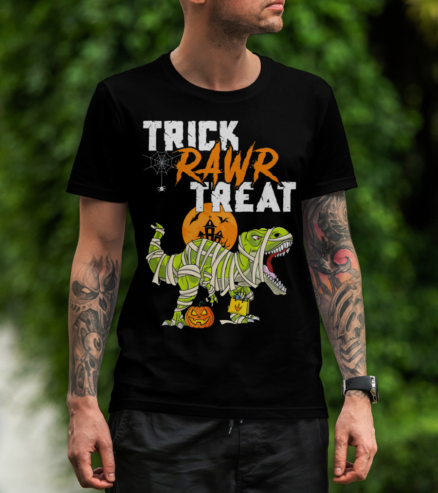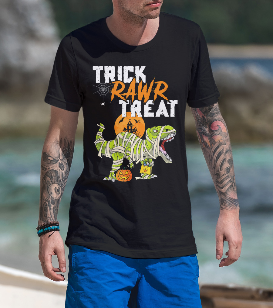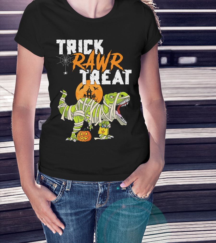 Trick Rawr Treat Dinosaur Mummy Halloween Rex Jack-O'-Lantern T-Shirt
