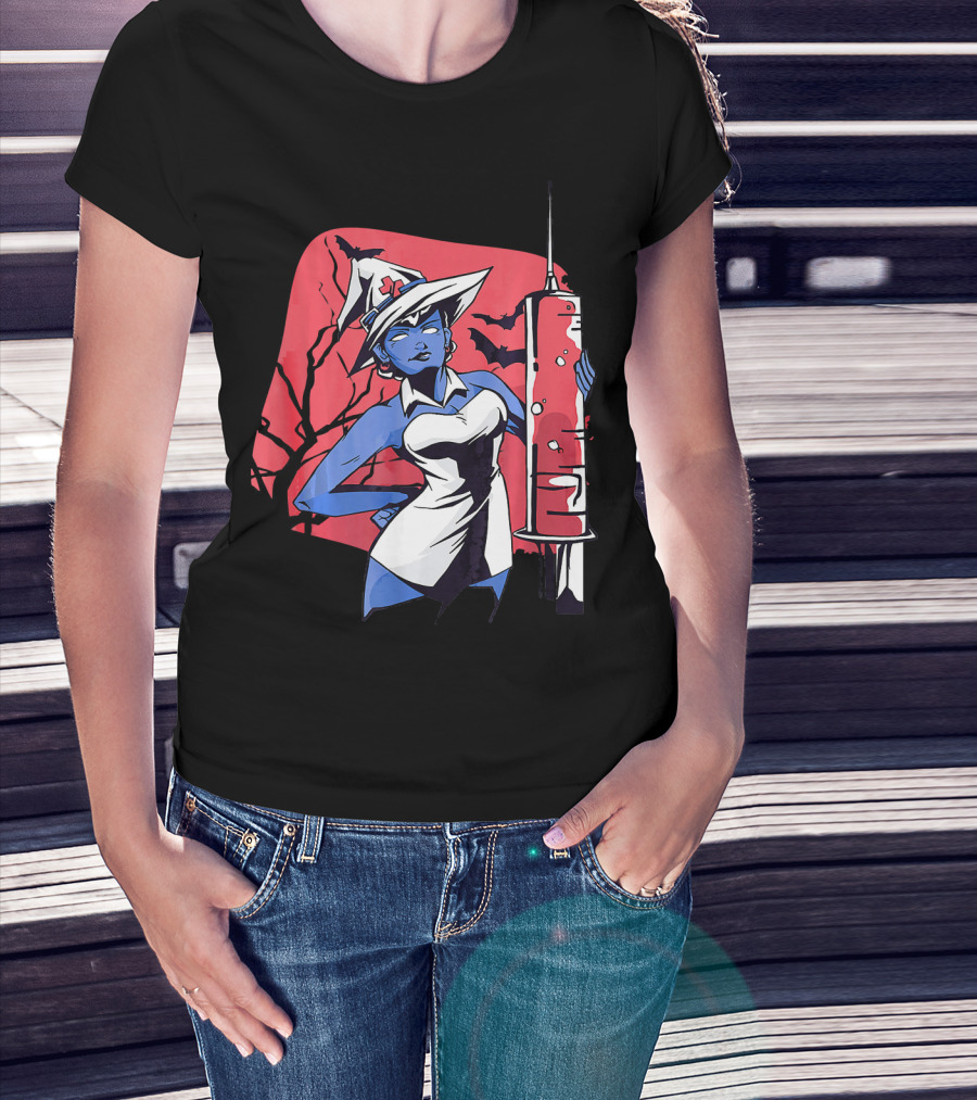 The Halloween Witch Nurse Holding Syringe with Witch Hat and Bats T-shirt is designed for everyday wear and a consistent fit. Fabric is pre-shrunk ring-spun cotton with durable stitching. See the size chart below for exact measurements.