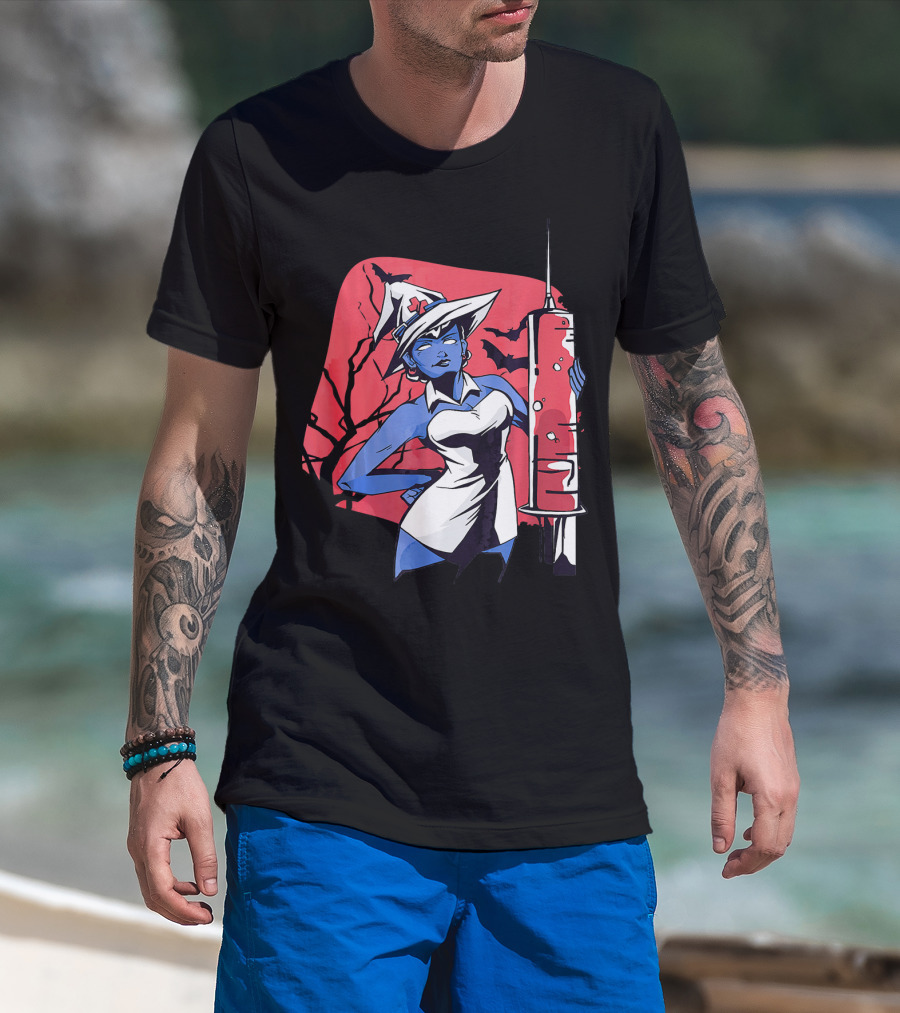 Halloween Witch Nurse Holding Syringe With Witch Hat And Bats T-Shirt