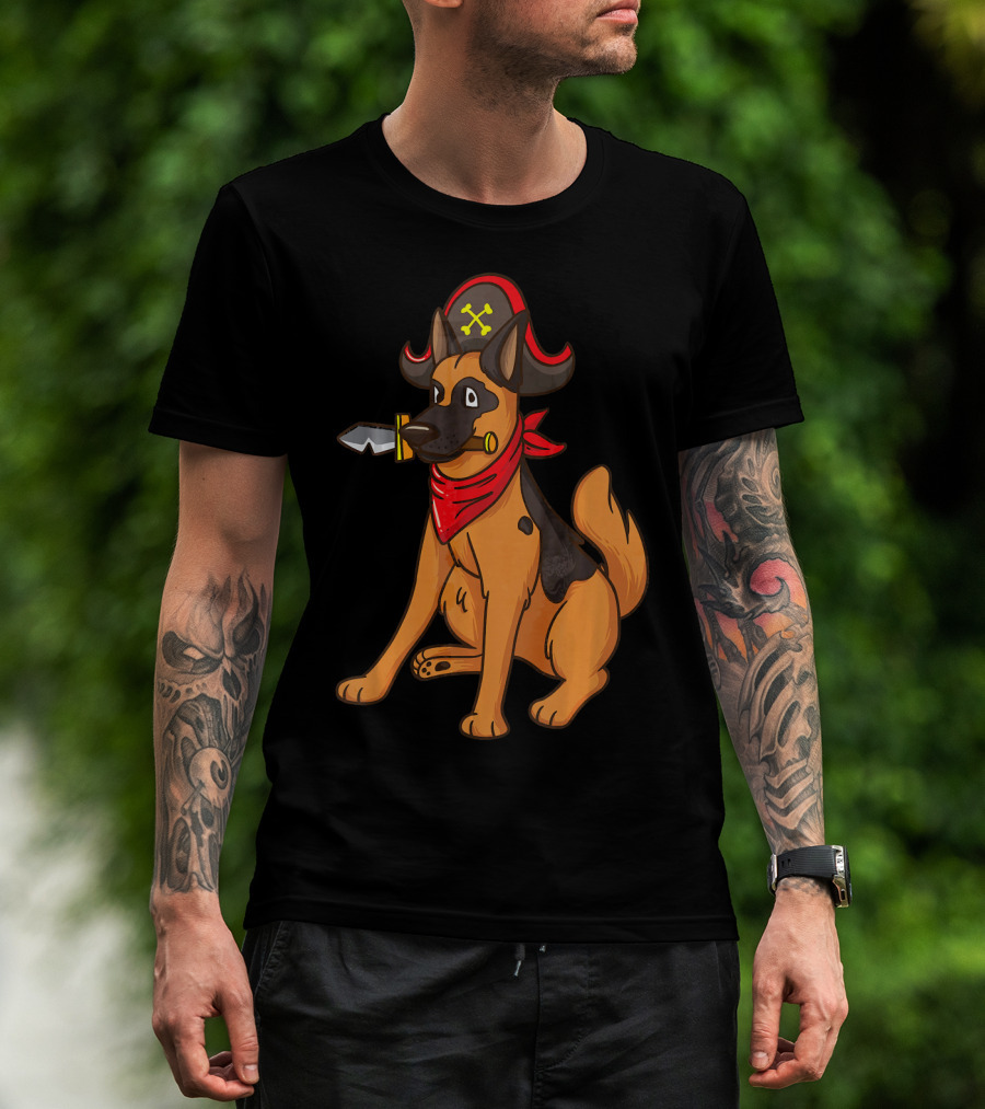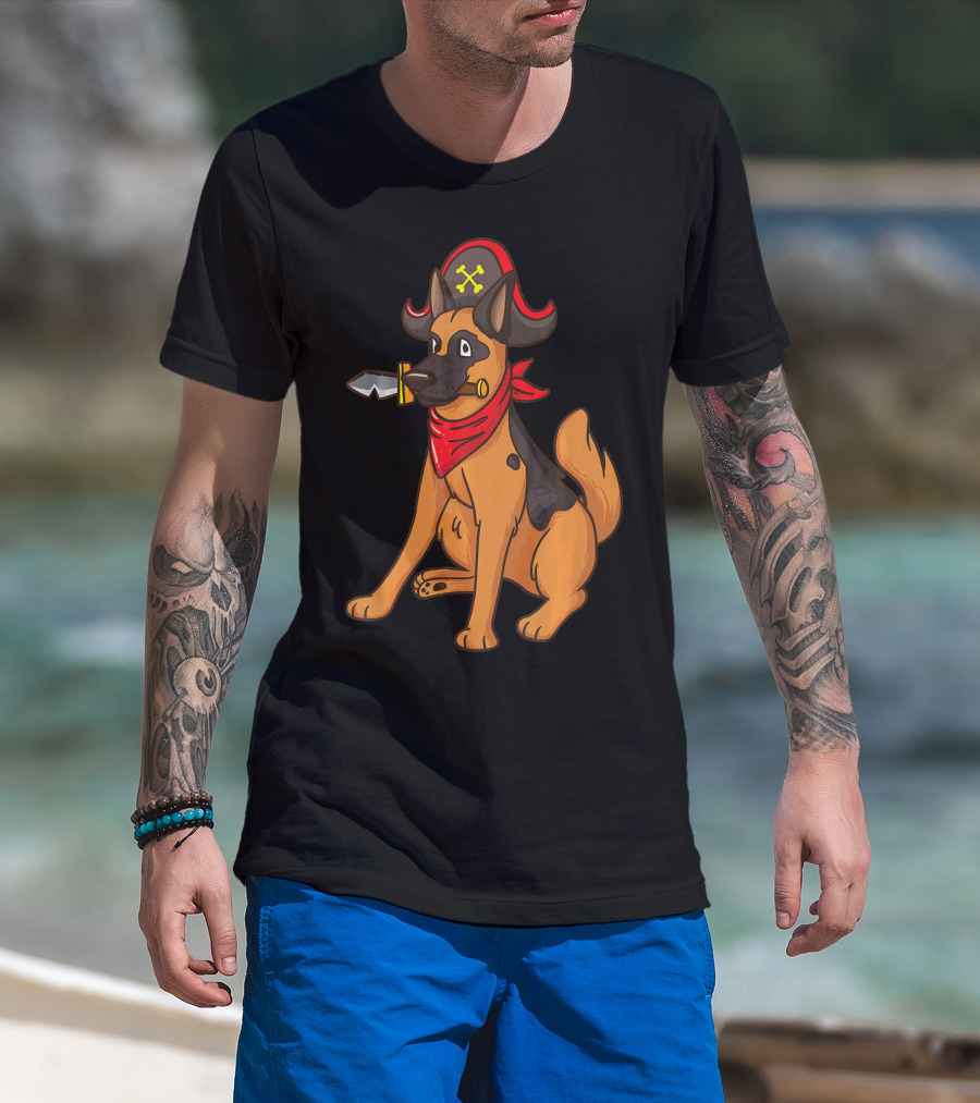 The Pirate German Shepherd with Red Bandana and Hat for Halloween T-shirt is designed for everyday wear and a consistent fit. Fabric is pre-shrunk ring-spun cotton with durable stitching. See the size chart below for exact measurements.