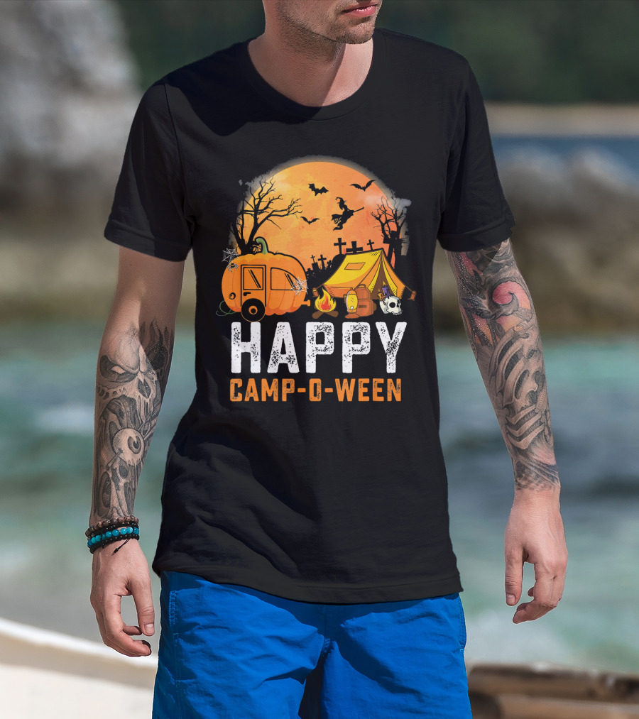 Funny Happy Camp O Ween Camping Halloween Scene With Pumpkin Caravan And Tent T-Shirt
