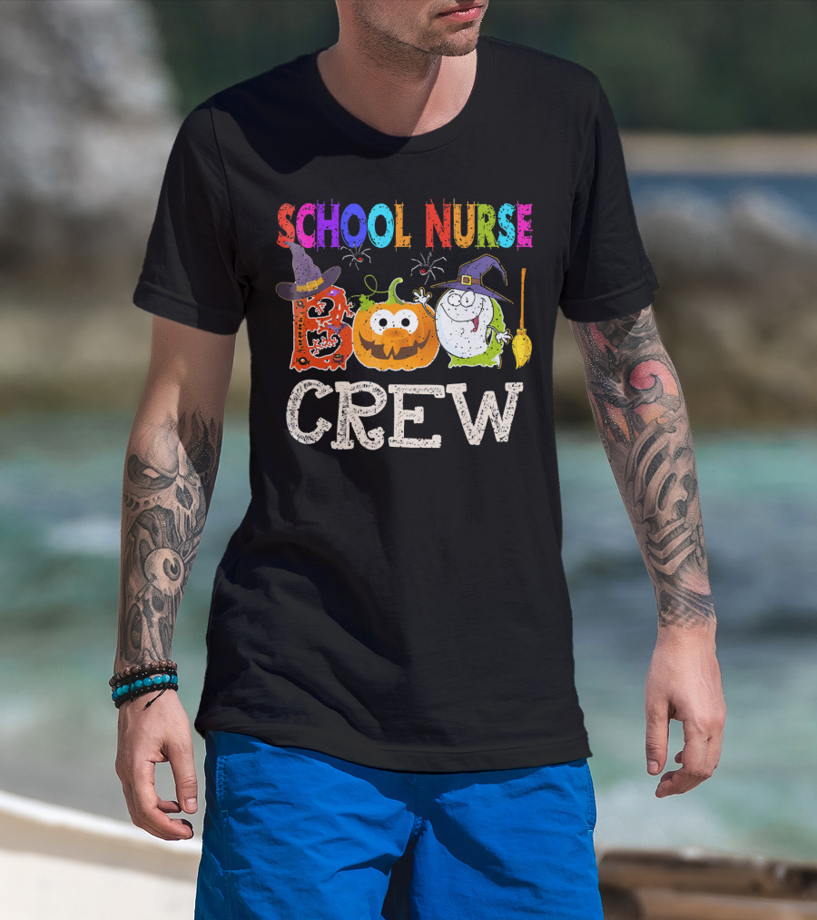 School Nurse Boo Crew Halloween Pumpkin Ghost Witches Hat Broom T-Shirt