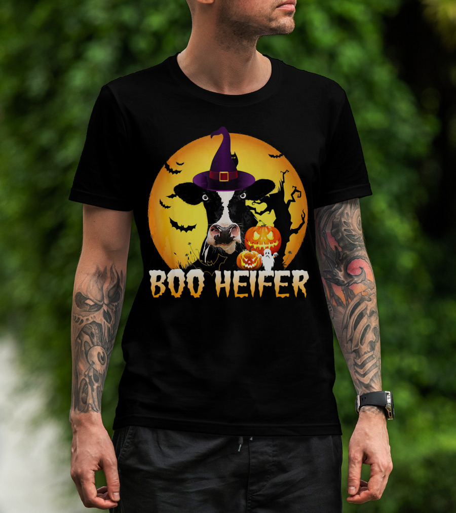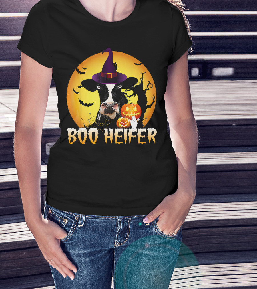 Boo Heifer Witch Hat Cow Halloween Moon Pumpkins Ghost T-Shirt