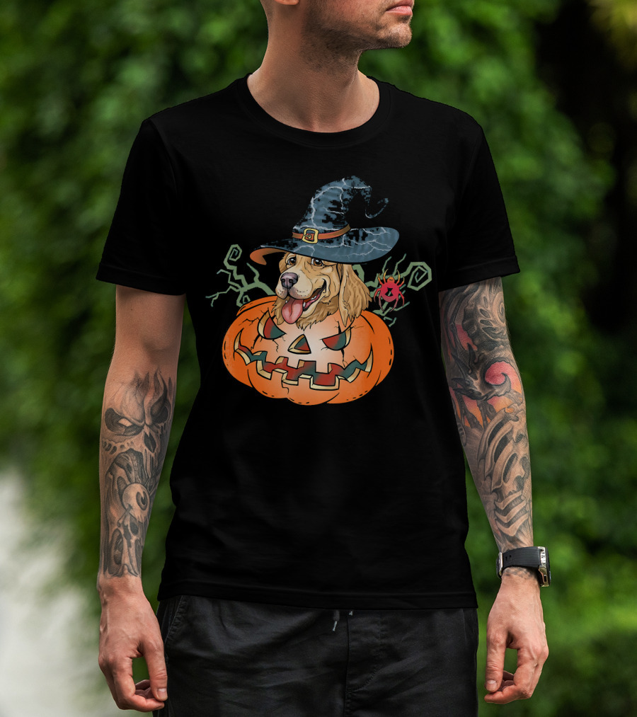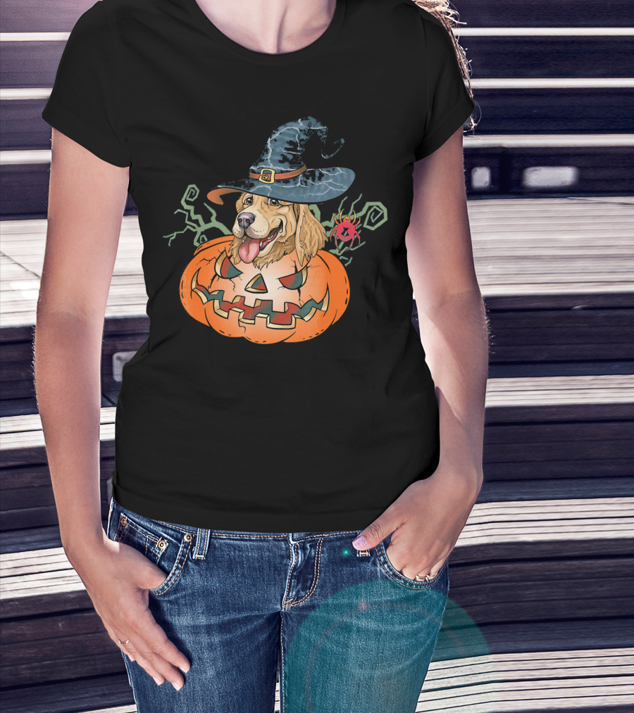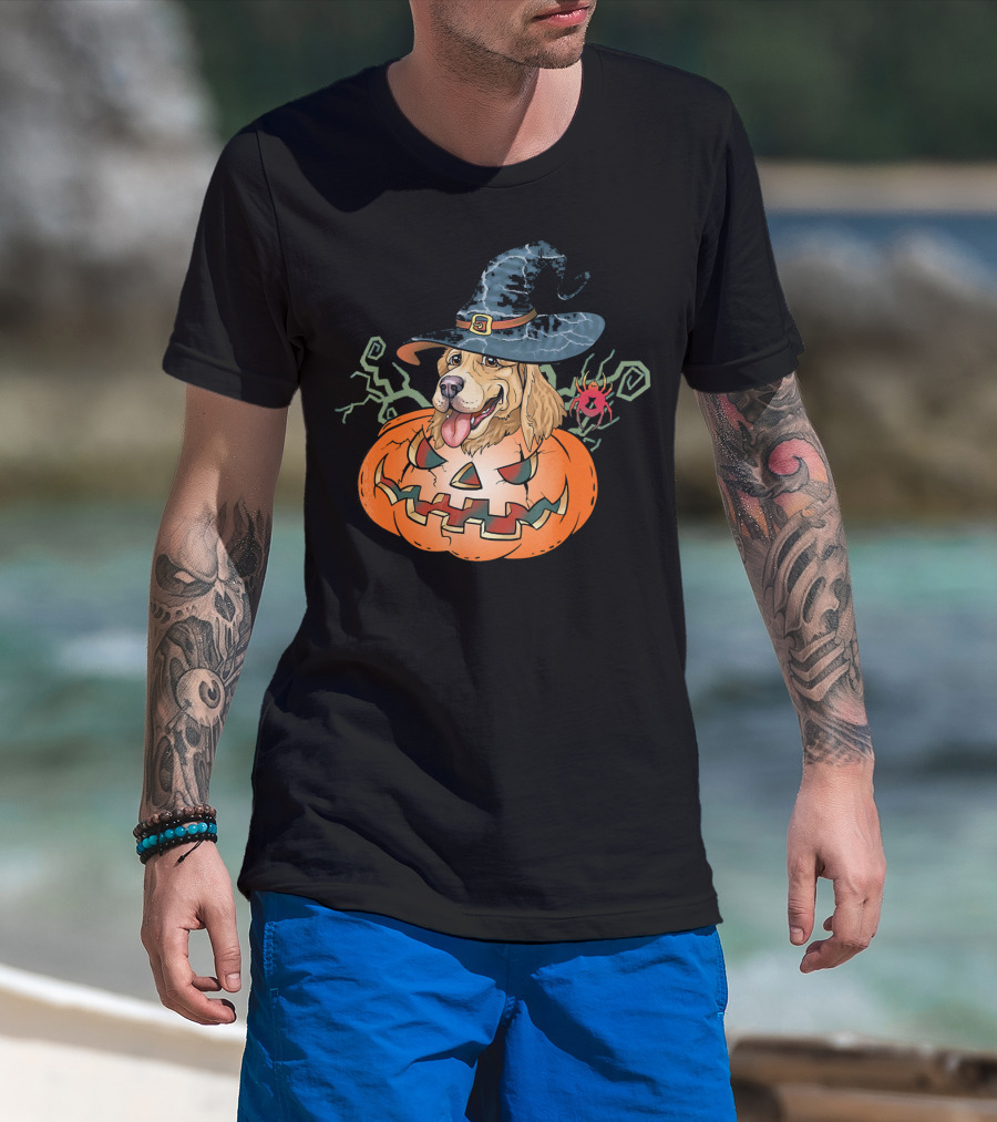 Halloween Golden Retriever Dog Lover Pumpkin Wizard Hat And Spider T-Shirt