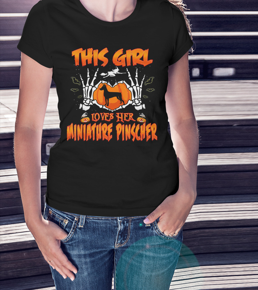Halloween Skeleton Hands And Pumpkin This Girl Loves Her Miniature Pinscher T-Shirt