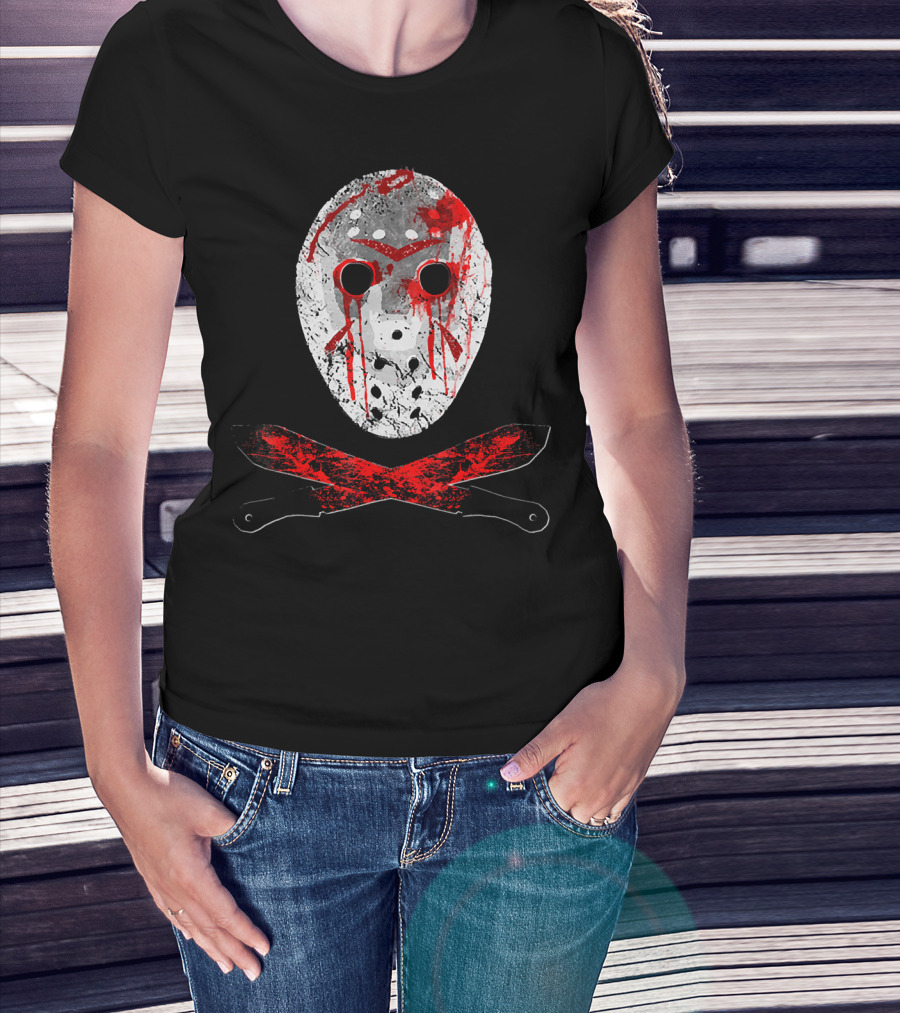 Friday The 13th Jason Mask Bloody Machete Crossed Horror T-Shirt