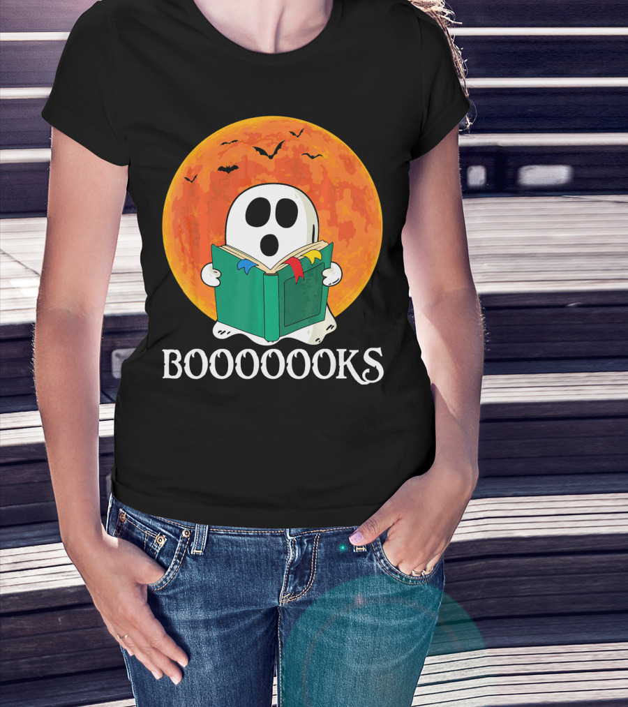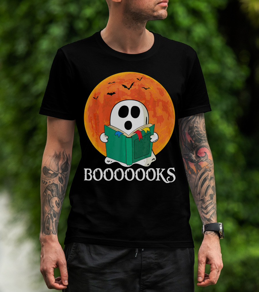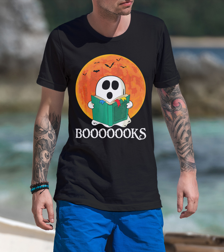 Funny Halloween Booooks Cute Ghost Reading With Full Moon And Bats T-Shirt