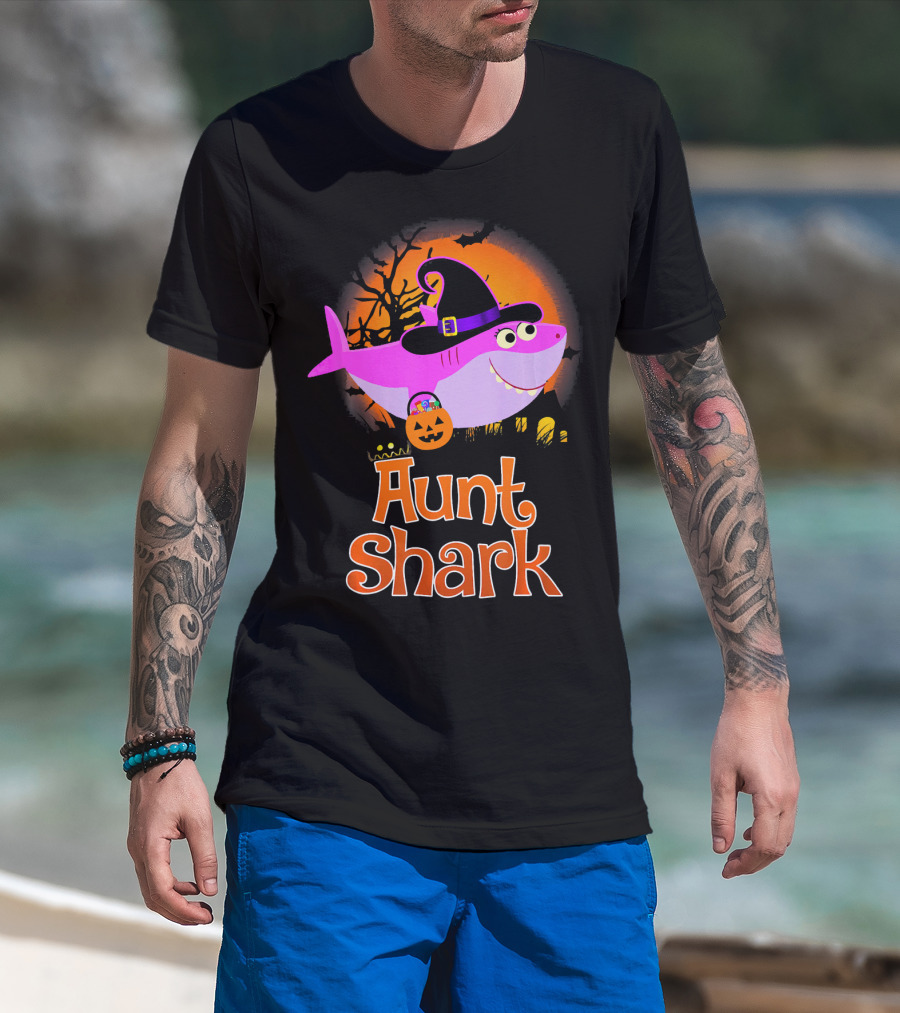 Aunt Shark Halloween Witch With Pumpkin On Orange Full Moon T-Shirt