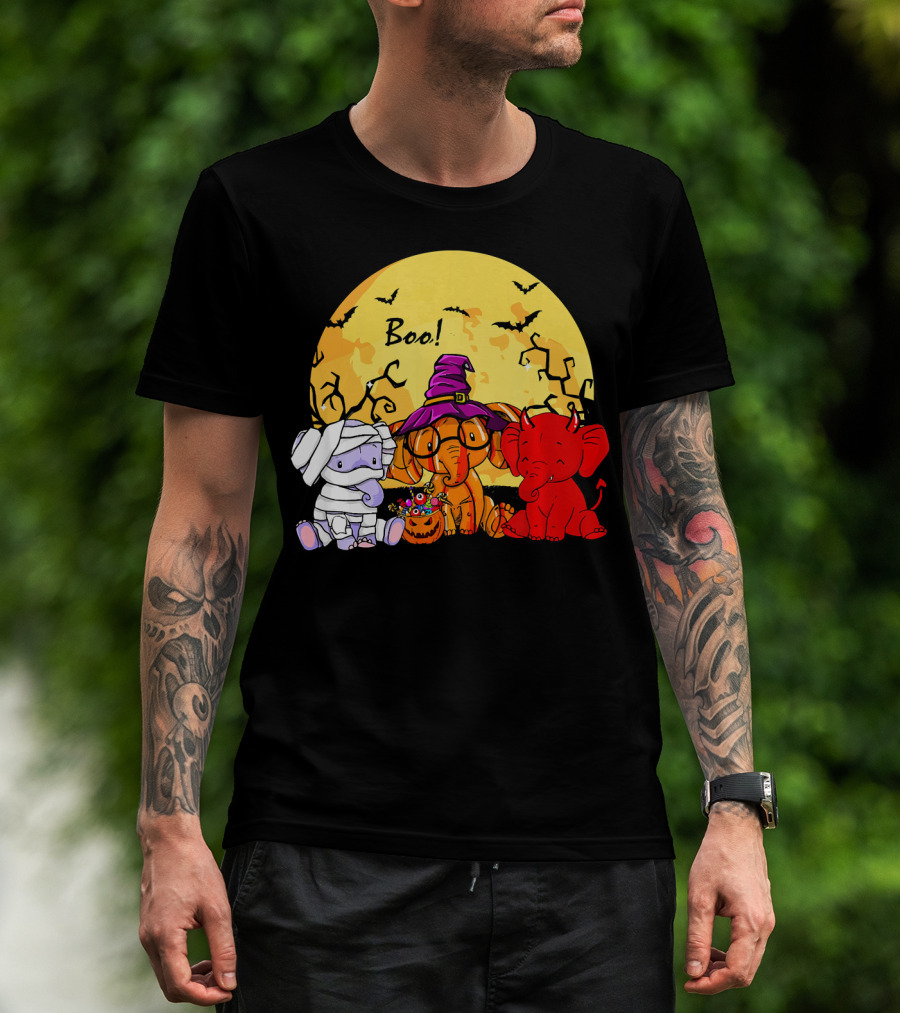 Boo Three Elephants Halloween Costume Party With Moon And Bats T-Shirt