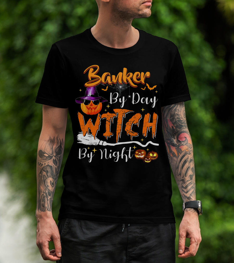 The Banker By Day Witch By Night Halloween Pumpkin Broomstick Bats Spiderweb T-shirt is designed for everyday wear and a consistent fit. Fabric is pre-shrunk ring-spun cotton with durable stitching. See the size chart below for exact measurements.