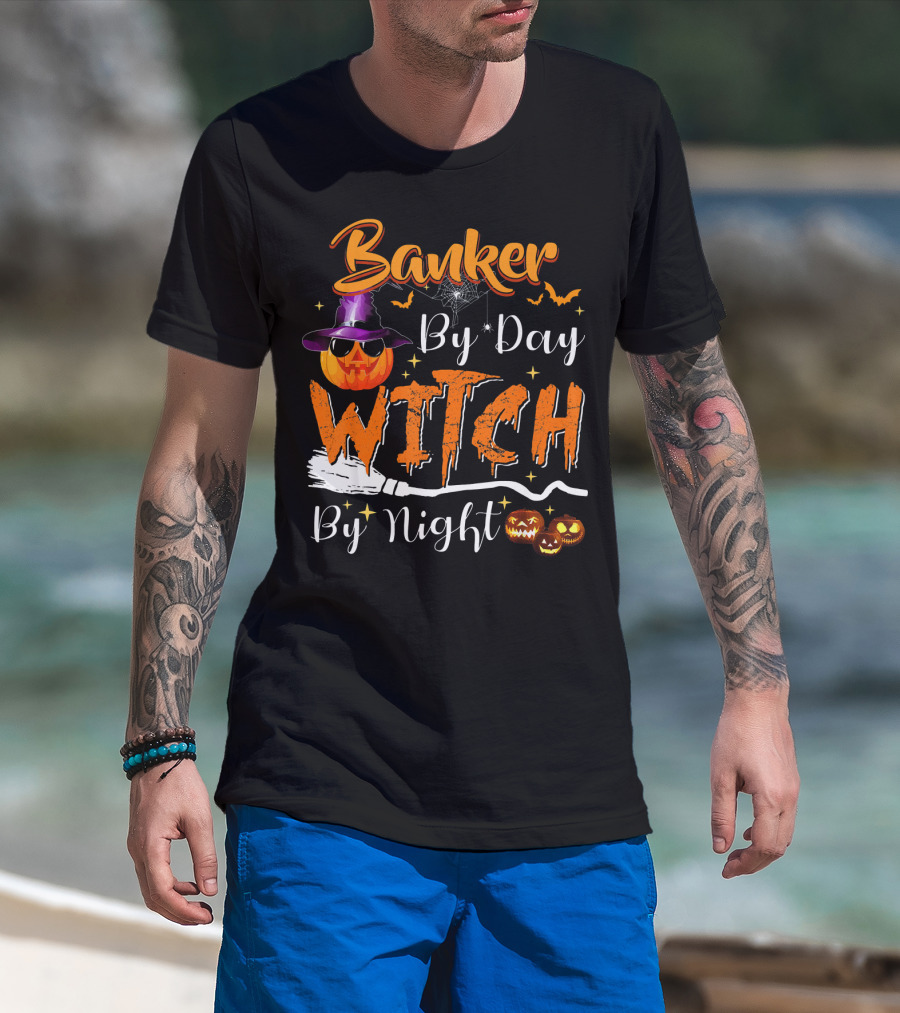 Banker By Day Witch By Night Halloween Pumpkin Broomstick Bats Spiderweb T-Shirt