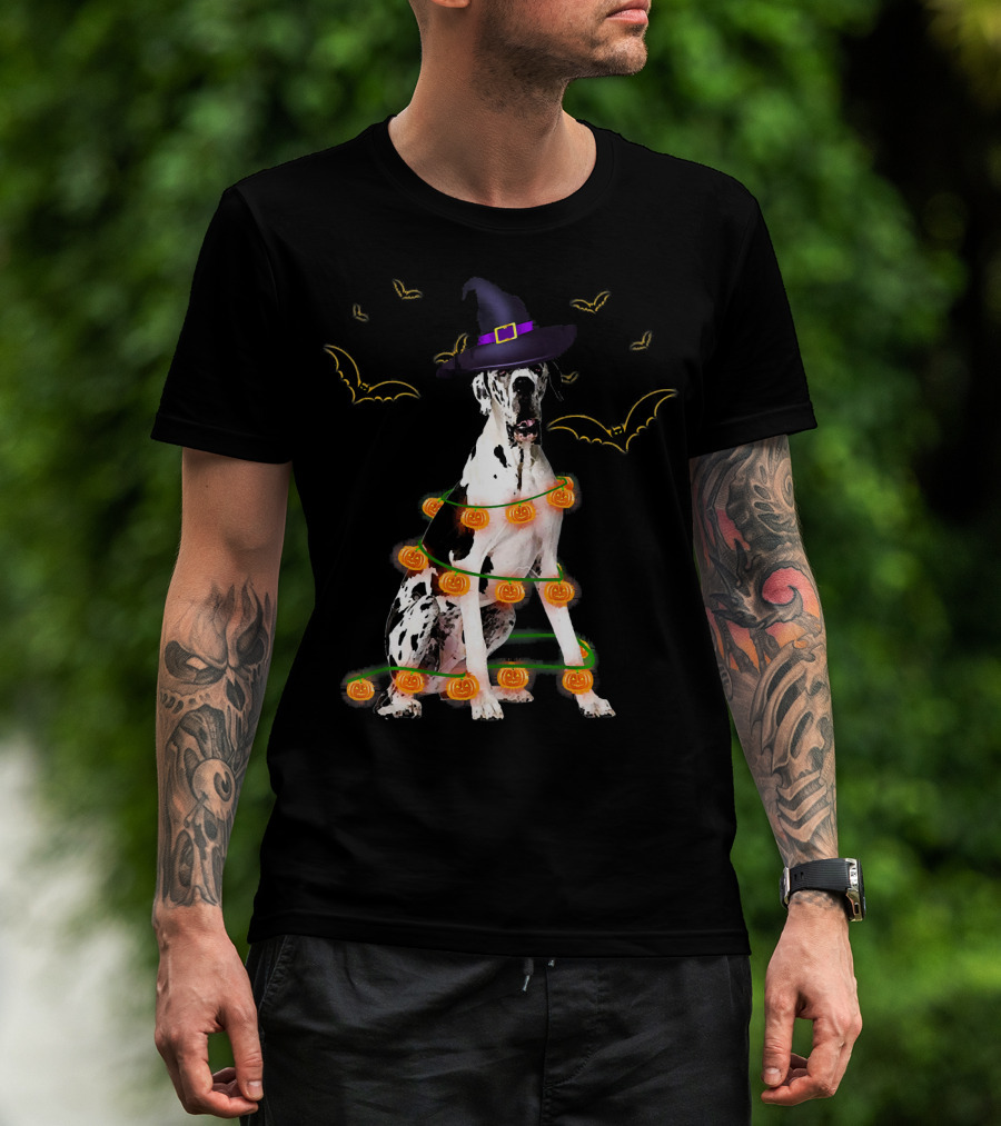 Halloween Great Dane Dog With Witch Hat And Pumpkin Lights Surrounded By Bats T-Shirt