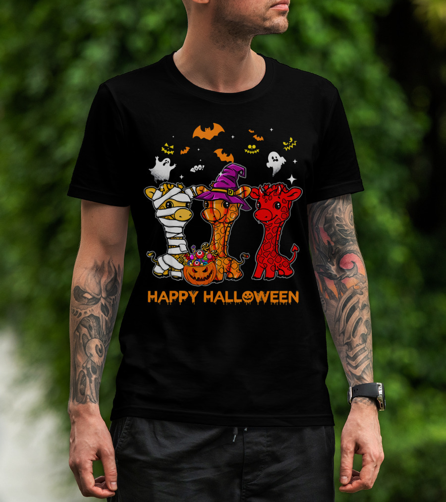How much will this Giraffe Trio in Halloween Costumes with Ghosts and Pumpkin Candy Happy Halloween Cute Mum shirt shrink?