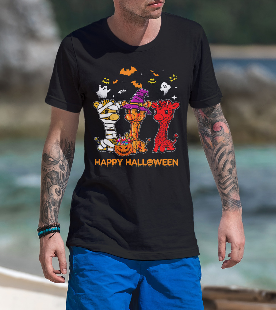 Giraffe Trio In Halloween Costumes With Ghosts And Pumpkin Candy Happy Halloween Cute Mum T-Shirt