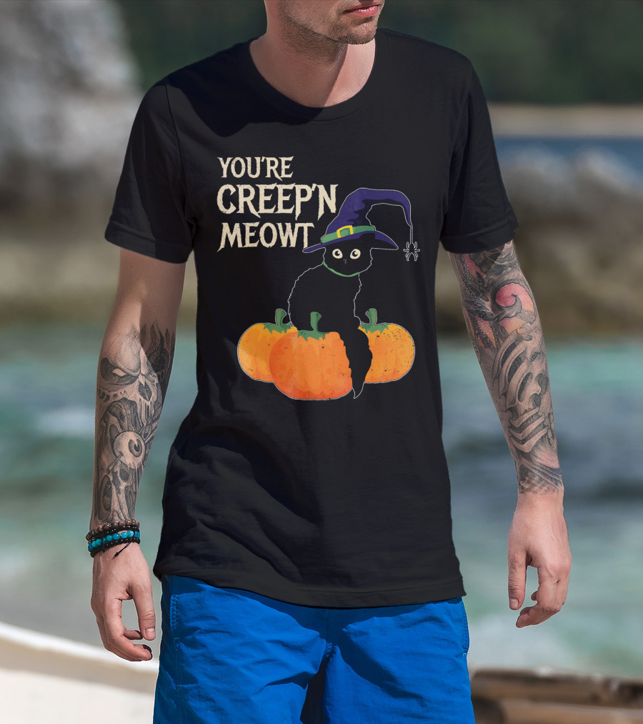 YOU'RE CREEP'N MEOWT Black Cat Halloween Pumpkins Witch Hat Spider T-Shirt