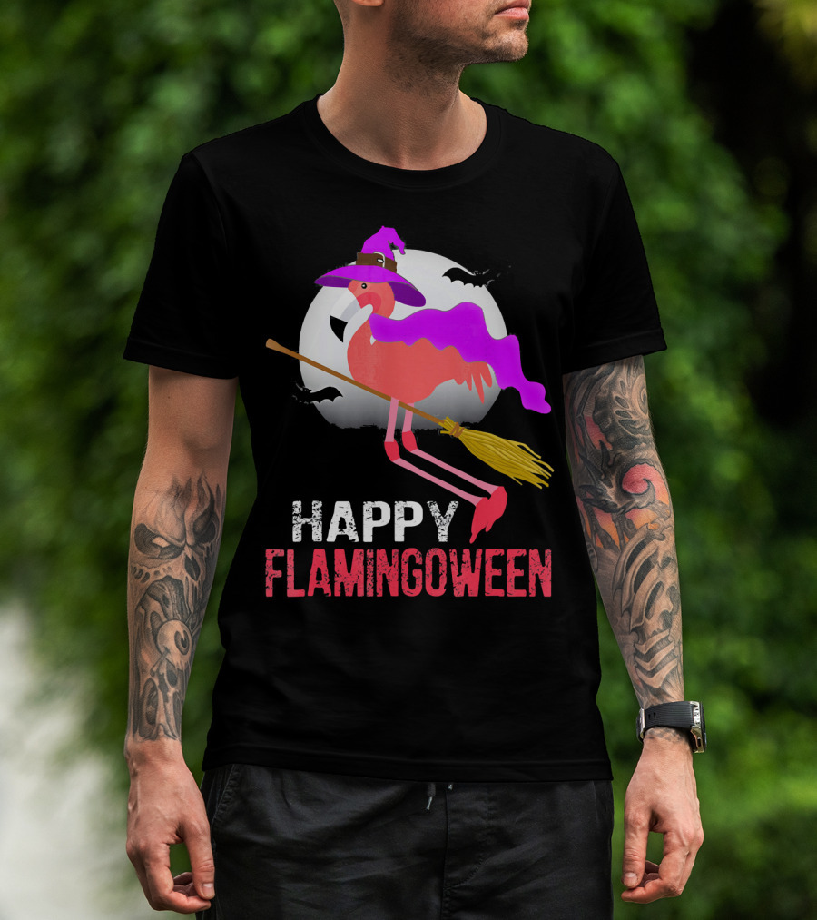 Happy Flamingoween Witch With Flamingo On Broomstick T-Shirt