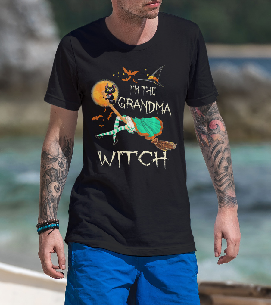 I'm The Grandma Witch Broomstick Flying Black Cat Halloween Bats T-Shirt