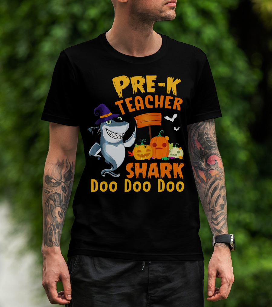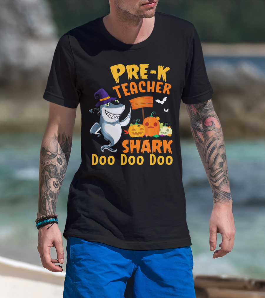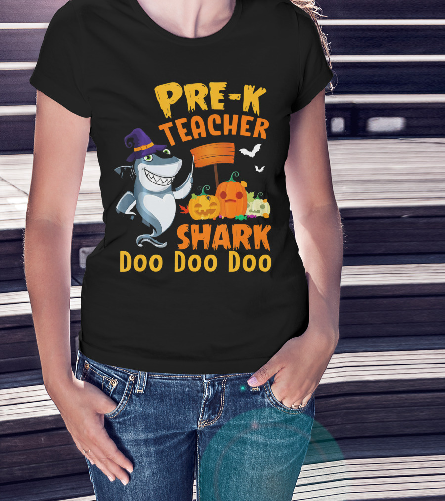 Pre-K Teacher Shark Doo Doo Doo Halloween Witch Pumpkins Bats T-Shirt