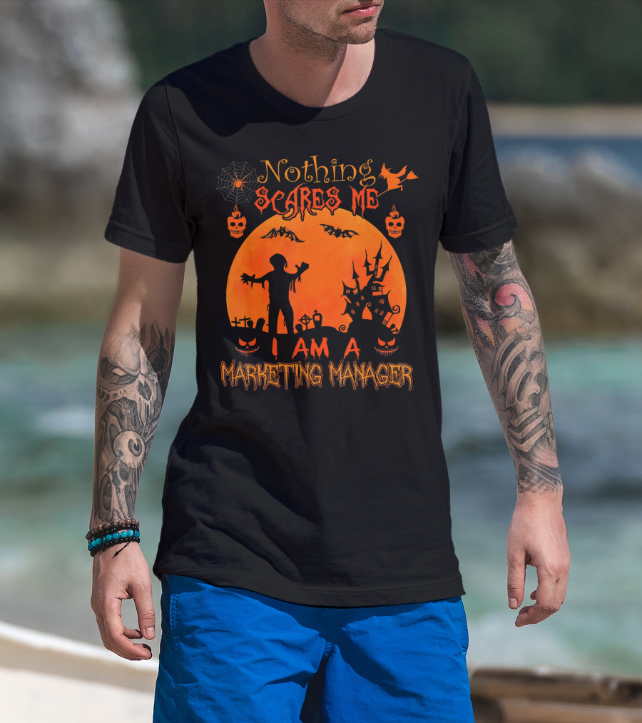 Nothing Scares Me I Am A Marketing Manager Halloween Zombies Haunted House Bats Spiderweb T-Shirt