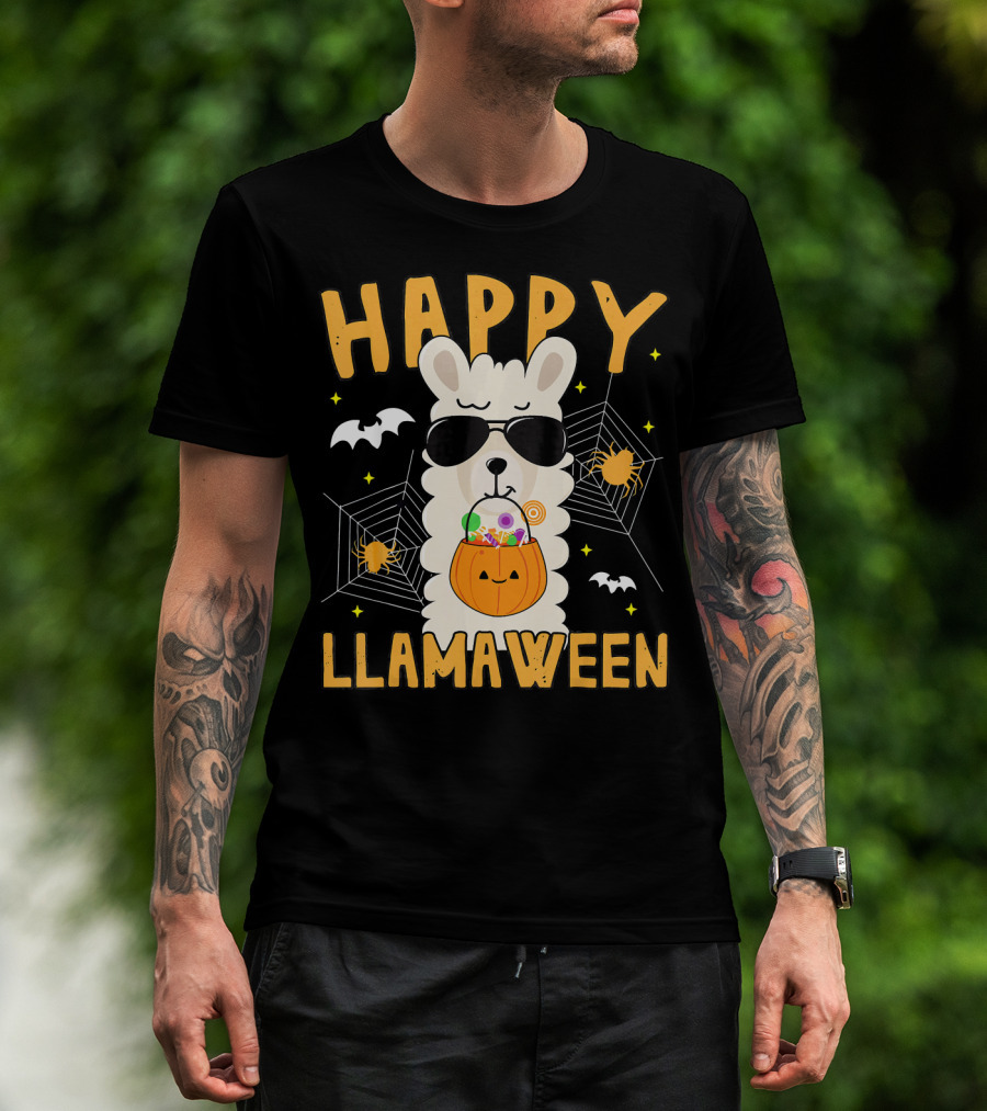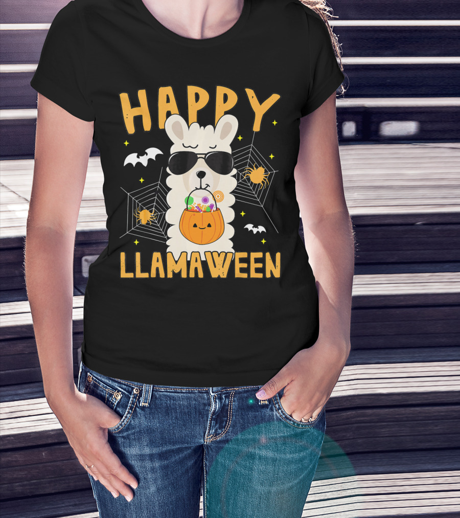 Happy Llamaween Halloween Llama With Sunglasses And Candy Basket T-Shirt