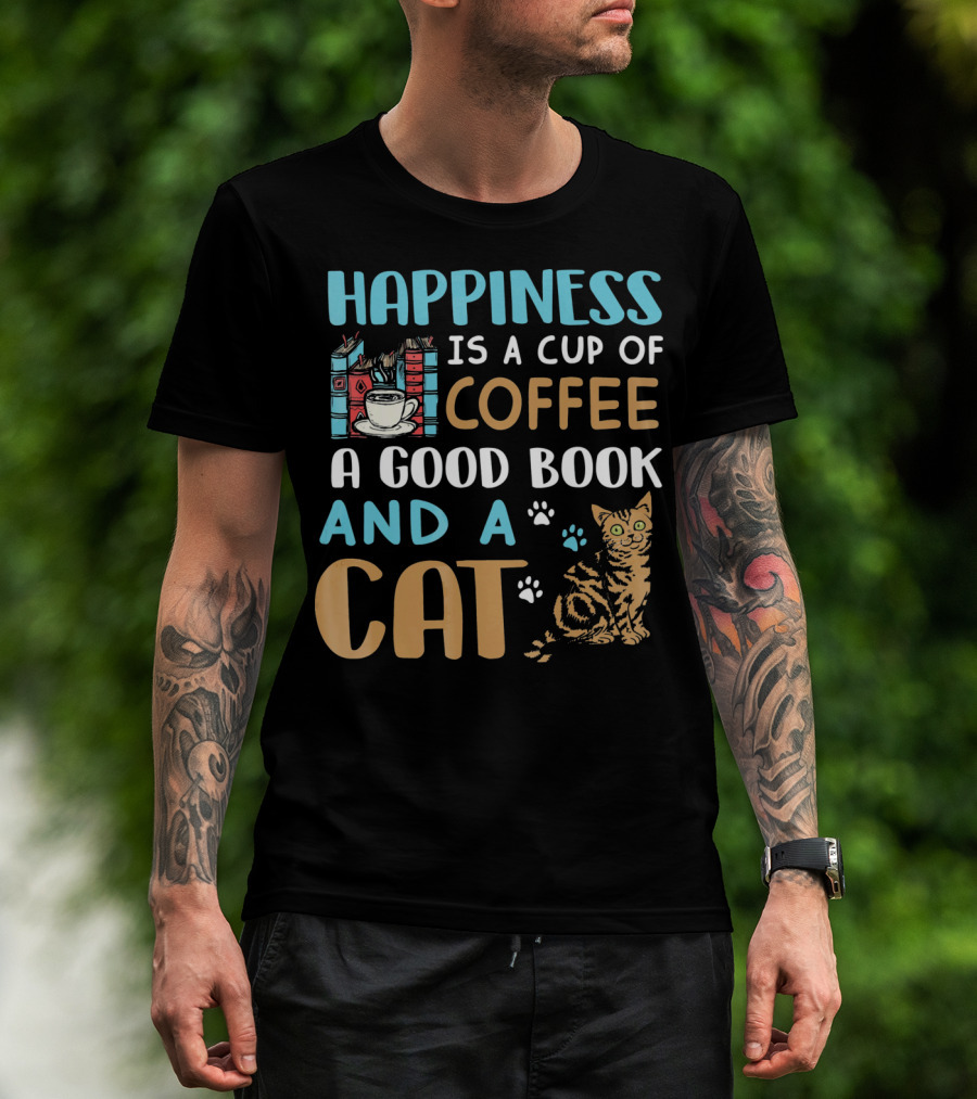 Happiness Is A Cup Of Coffee A Good Book And A Cat T-Shirt