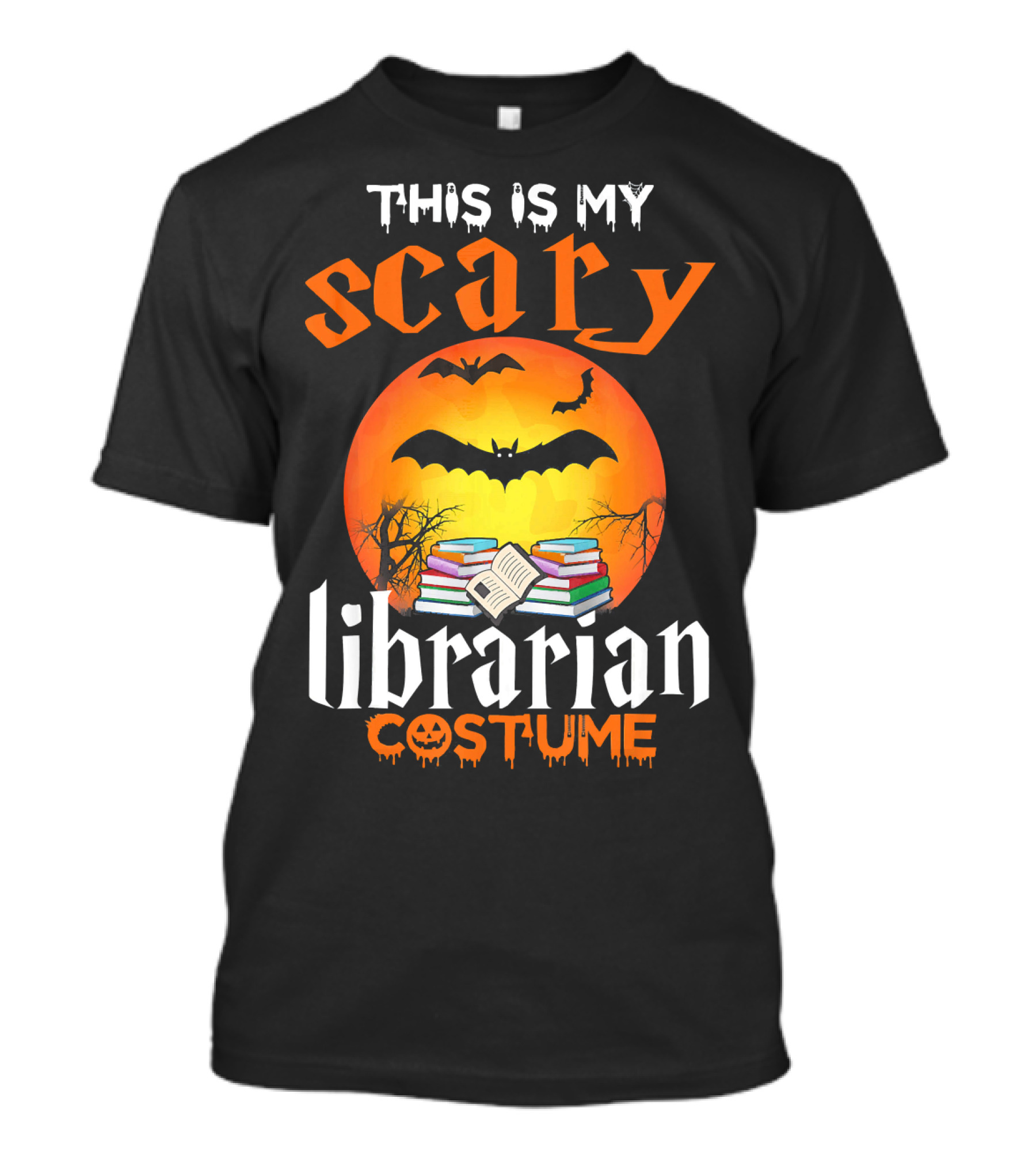 This Is My Scary Librarian Costume Halloween Books Bats Orange Moon T-Shirt