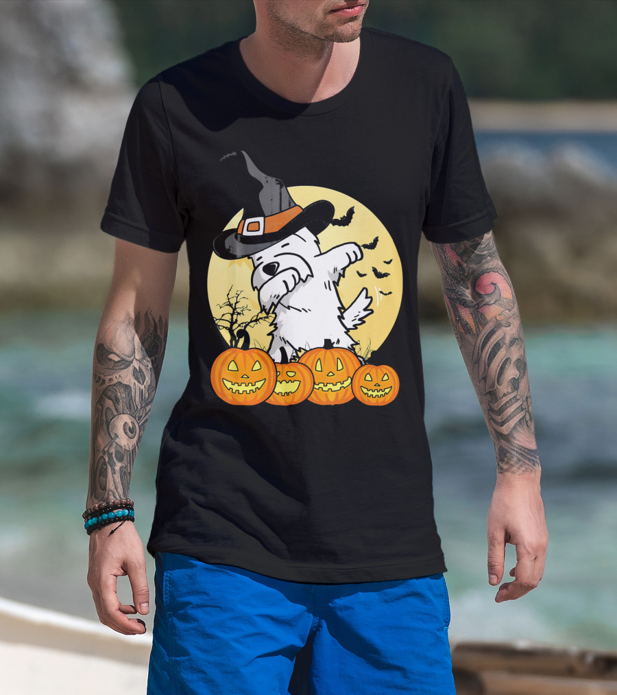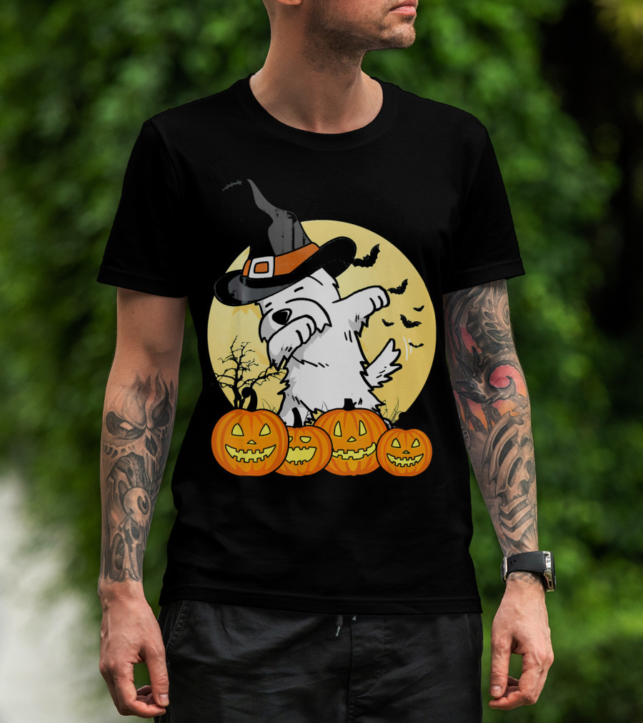 Funny Dabbing Westie Witch With Pumpkins And Bats Halloween Dog Dance T-Shirt