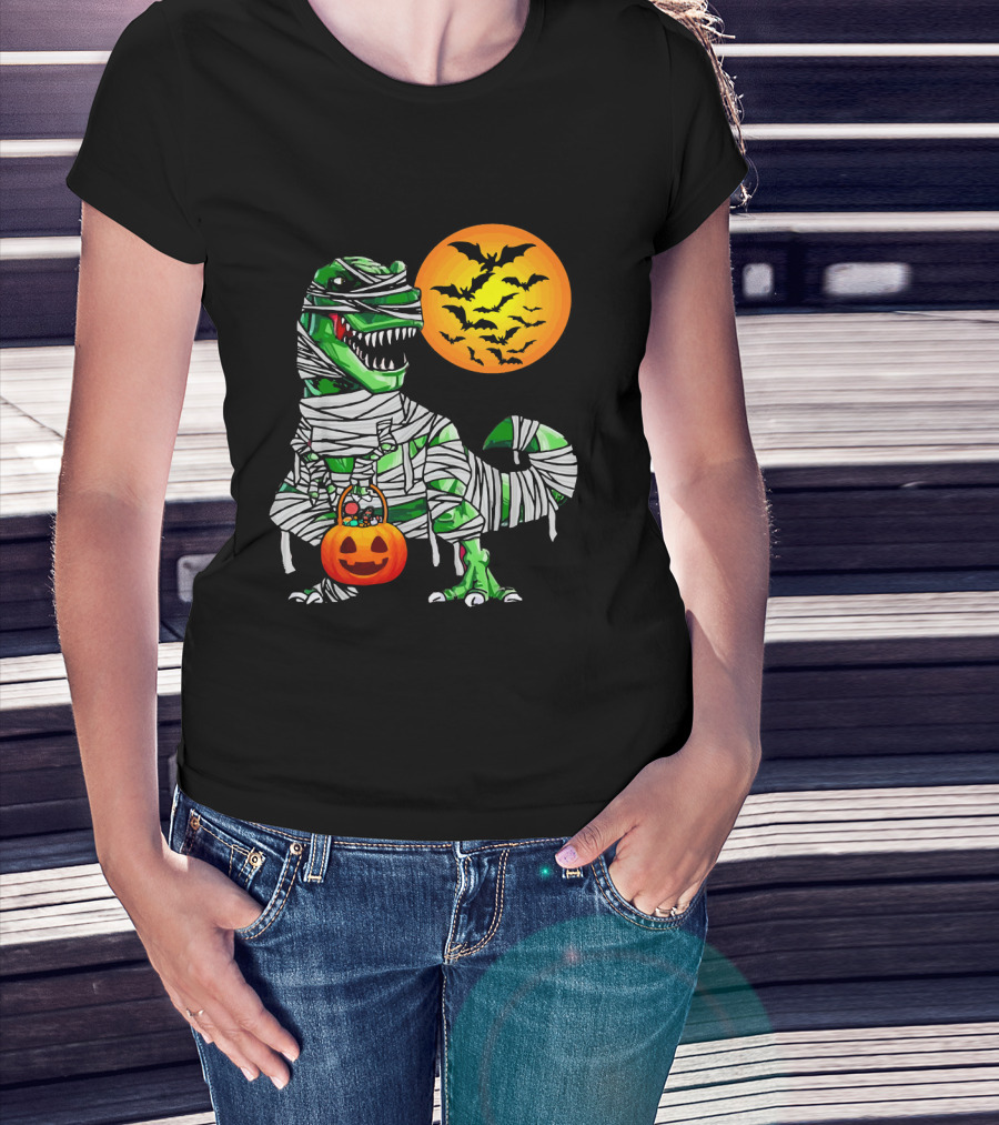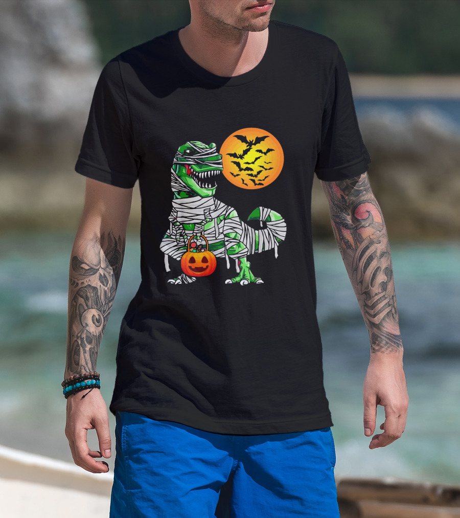 Tyrannosaurus Rex Dinosaur Mummy With Pumpkin And Bats Halloween Boy T-Shirt