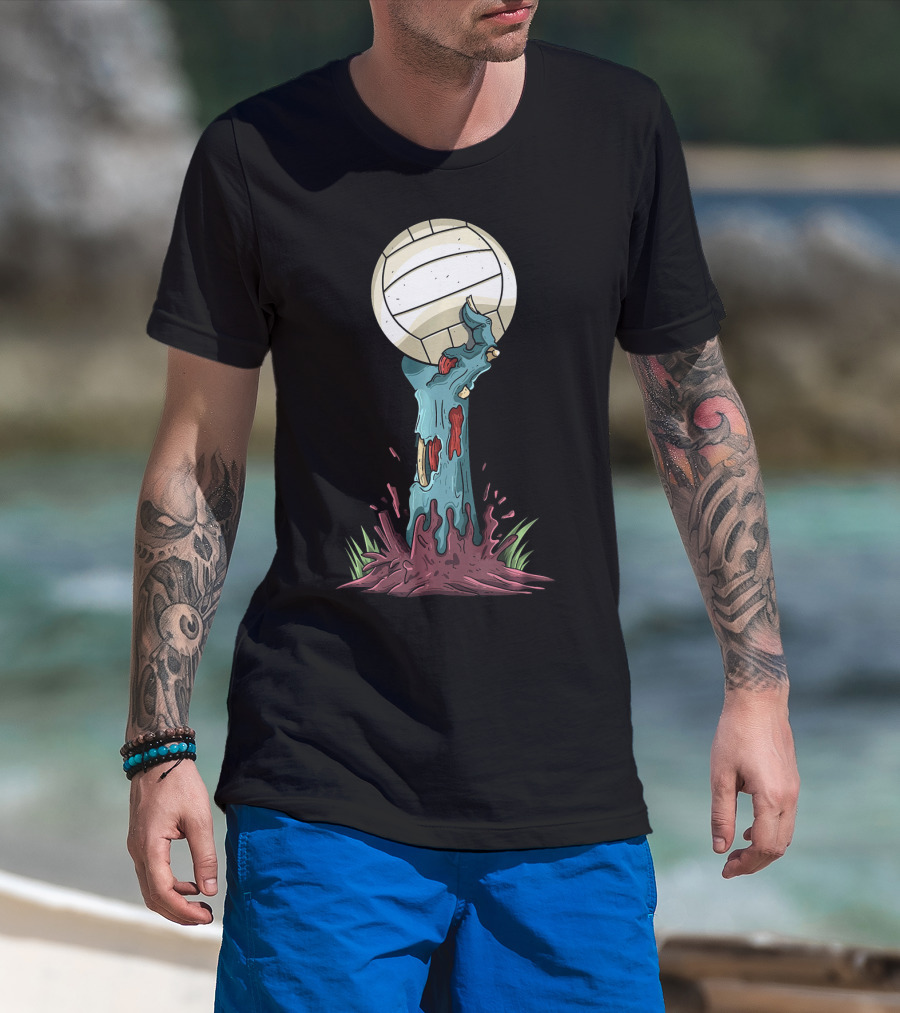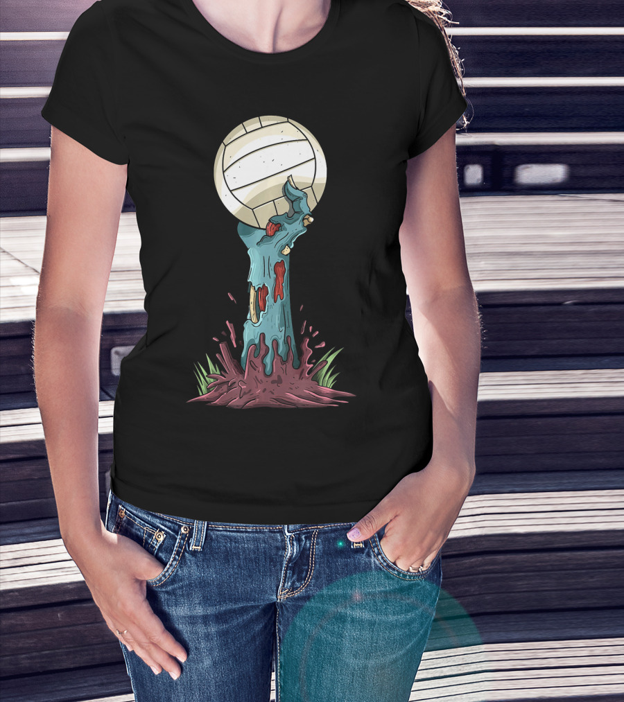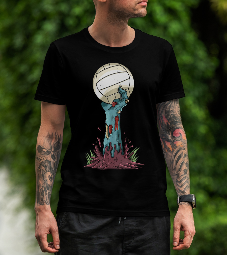 The Zombie Hands Rising with Volleyball T-shirt is designed for everyday wear and a consistent fit. Fabric is pre-shrunk ring-spun cotton with durable stitching. See the size chart below for exact measurements.
