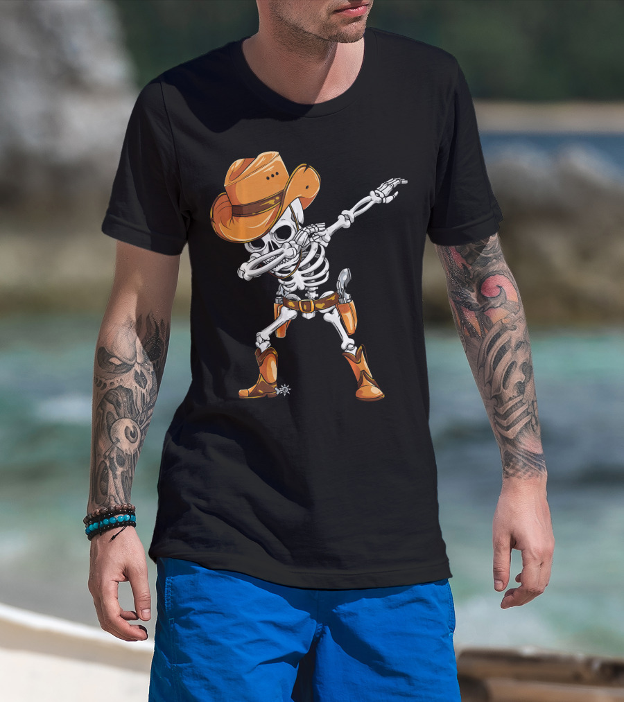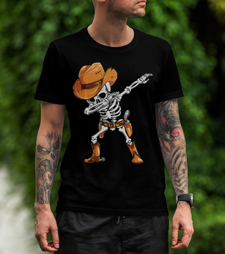 Dabbing Skeleton Cowboy In Orange Hat And Boots T-Shirt