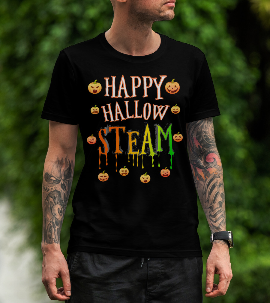 HAPPY HALLOW STEAM Pumpkin Faces Orange Green Dripping Letters T-Shirt