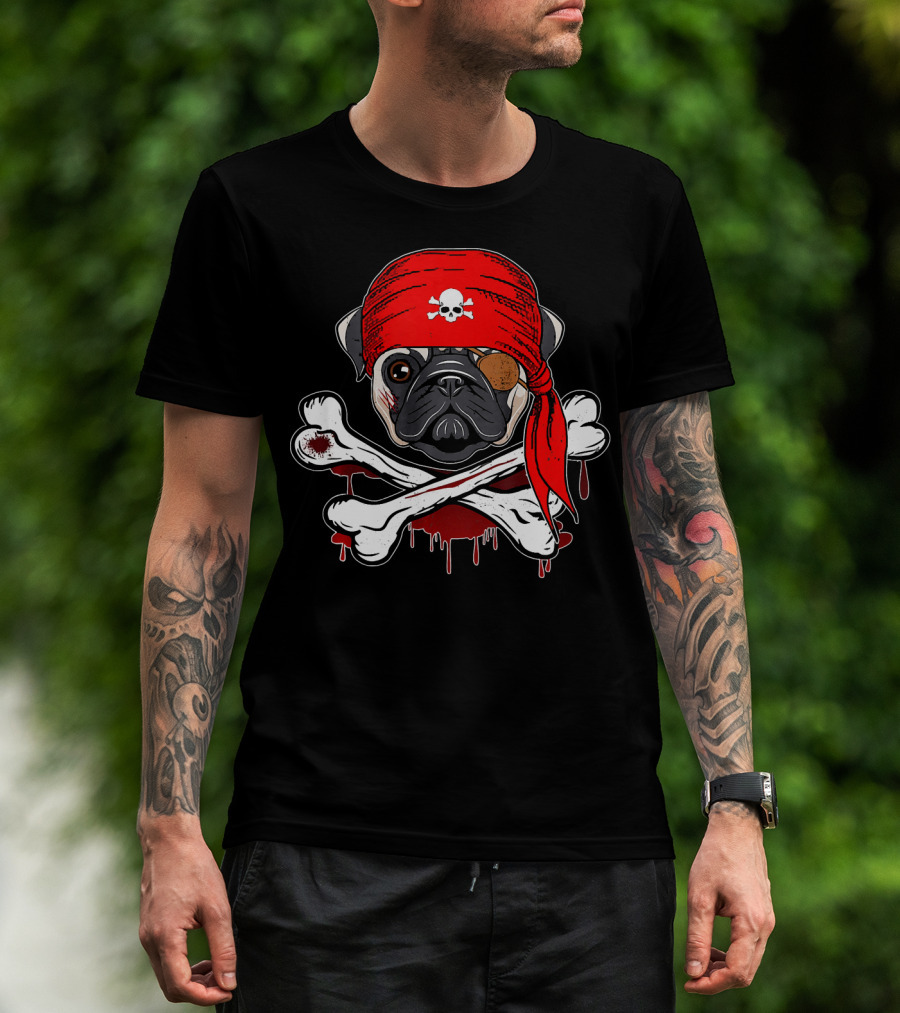 Funny Pirate Pug Dog With Skull Bandana And Crossbones T-Shirt