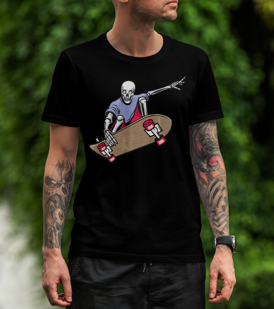 The Skeleton Skateboarding Halloween Trick Airtime T-shirt is designed for everyday wear and a consistent fit. Fabric is pre-shrunk ring-spun cotton with durable stitching. See the size chart below for exact measurements.