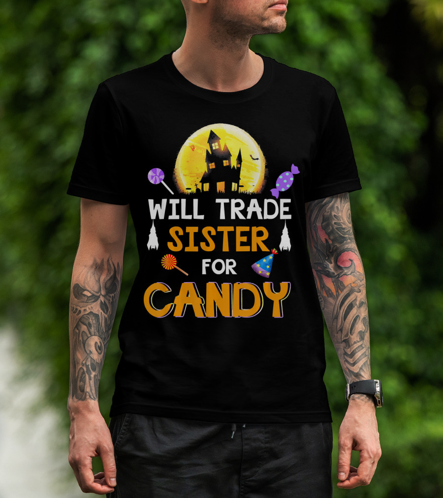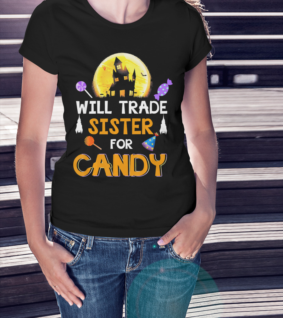 Will Trade Sister For Candy Halloween Haunted House Lollipops Moon T-Shirt