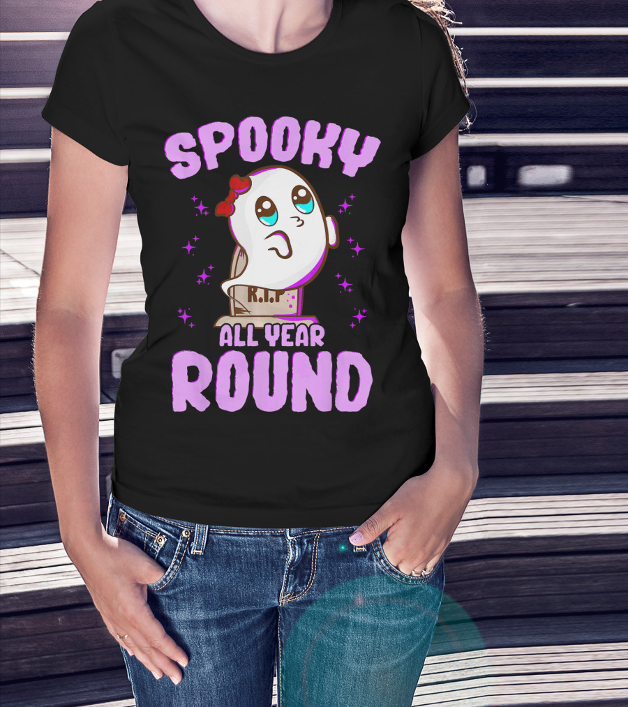 Spooky All Year Round Kawaii Ghost With Glittering Stars And Gravestone T-Shirt