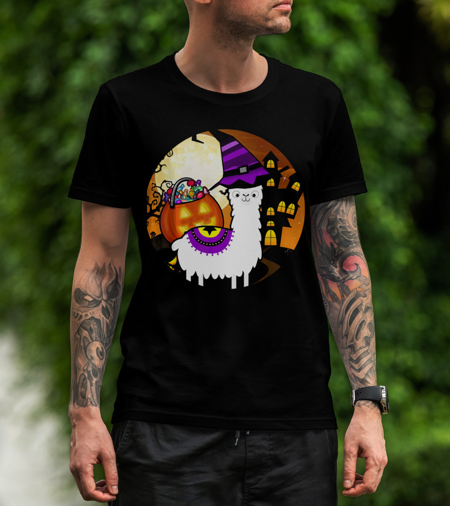 Halloween Llama Funny Alpaca With Witch Hat And Pumpkin House T-Shirt