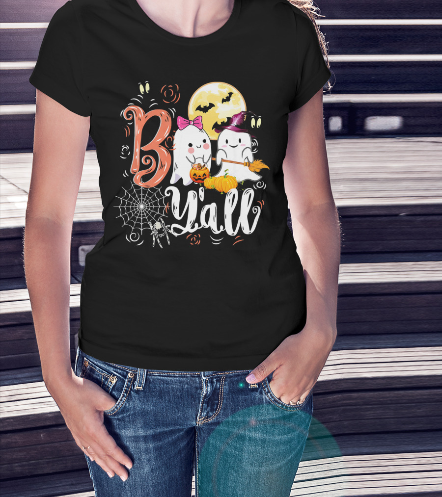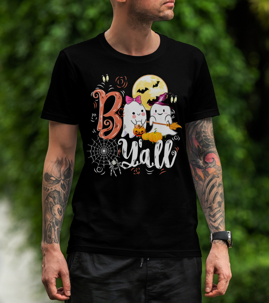 Boo Y’all Funny Ghosts With Pumpkin And Halloween Moon T-Shirt