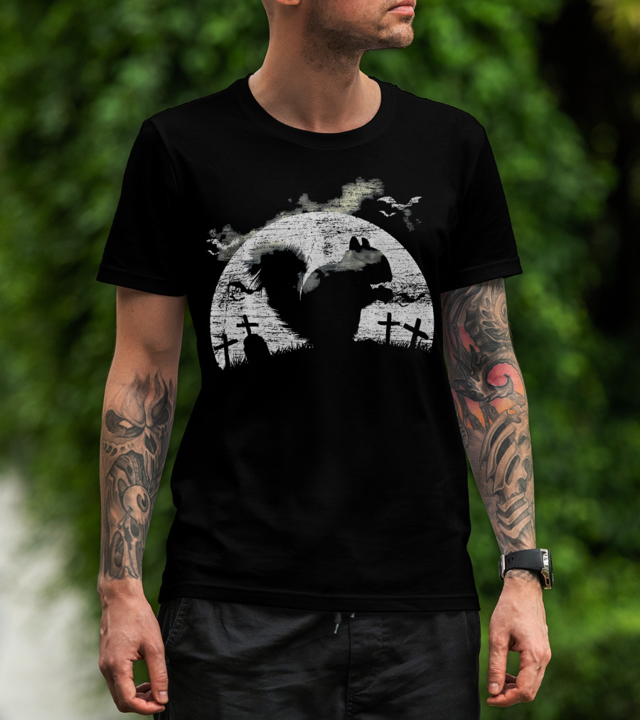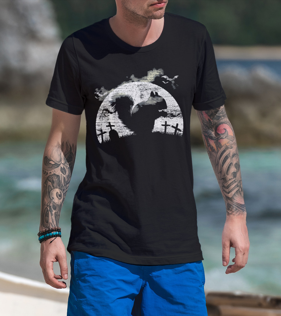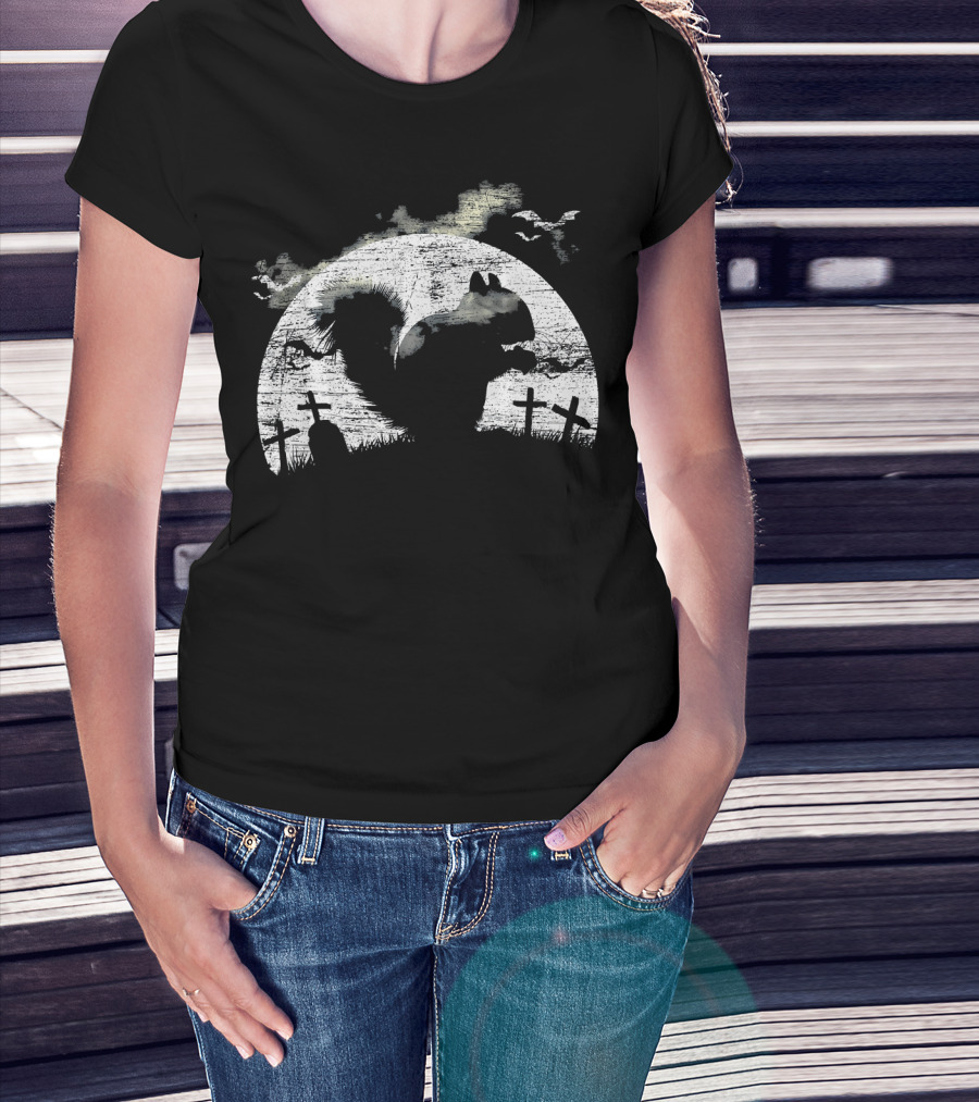 Halloween Squirrel Graveyard Silhouette With Full Moon And Bats T-Shirt