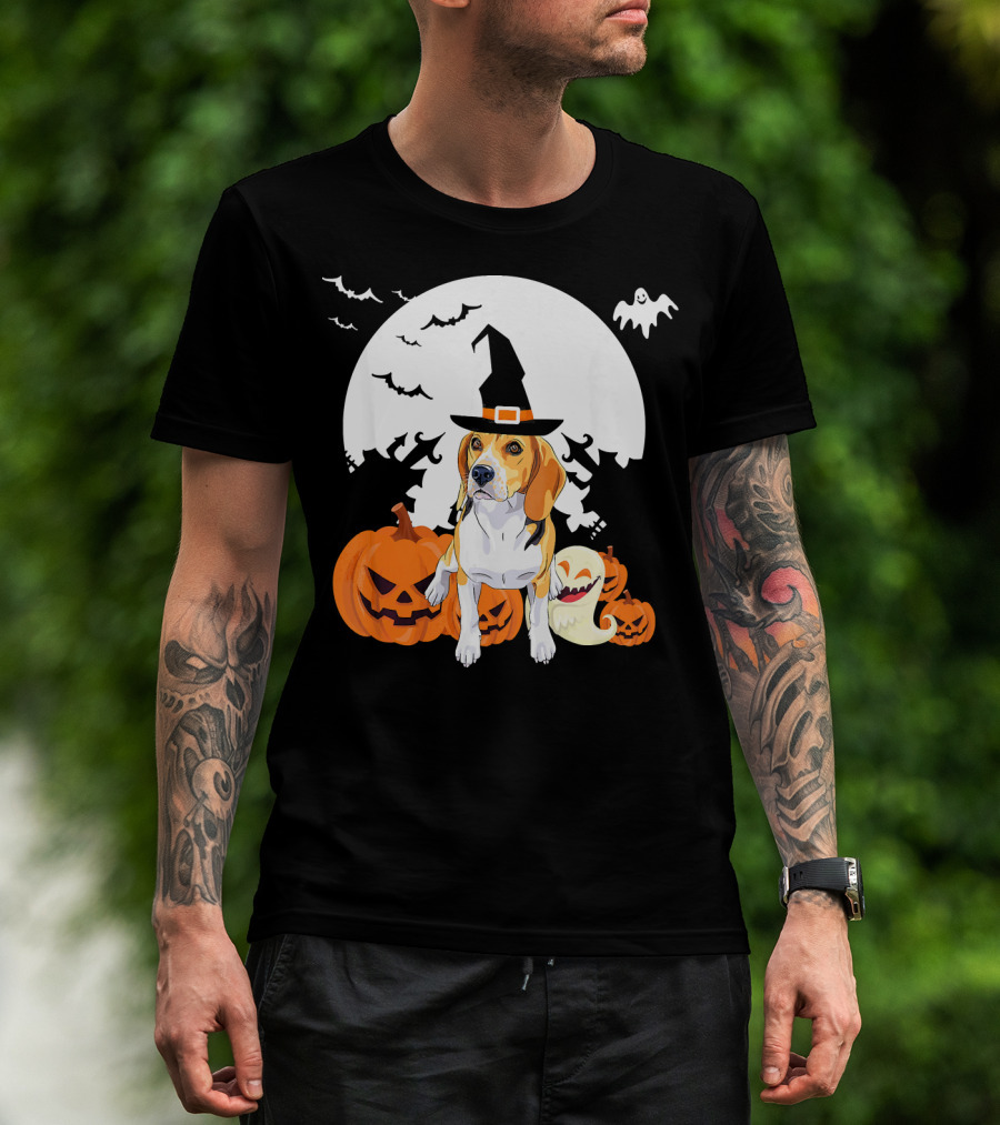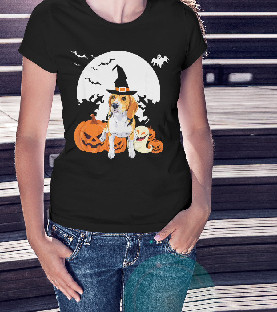 Happy Halloween Witch Beagle With Pumpkins And Ghosts T-Shirt