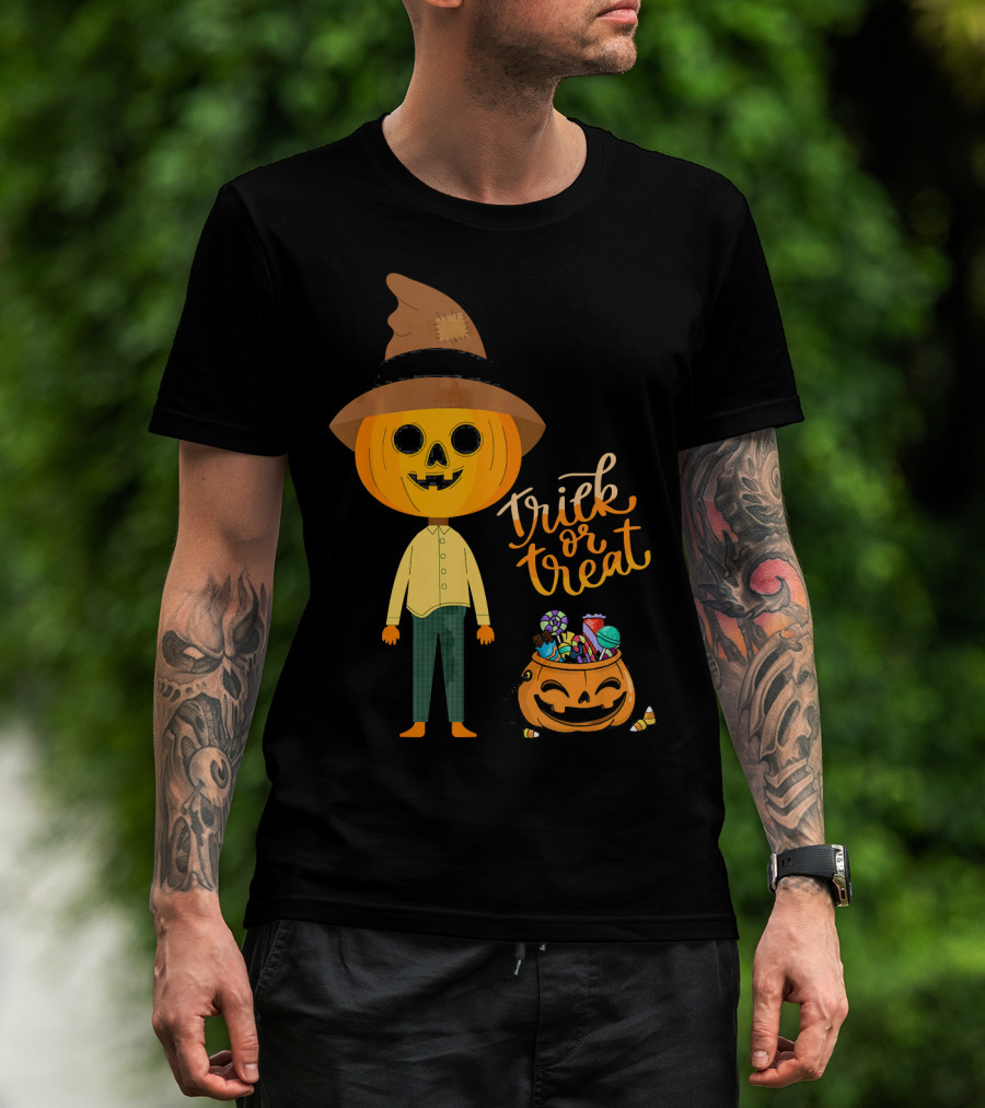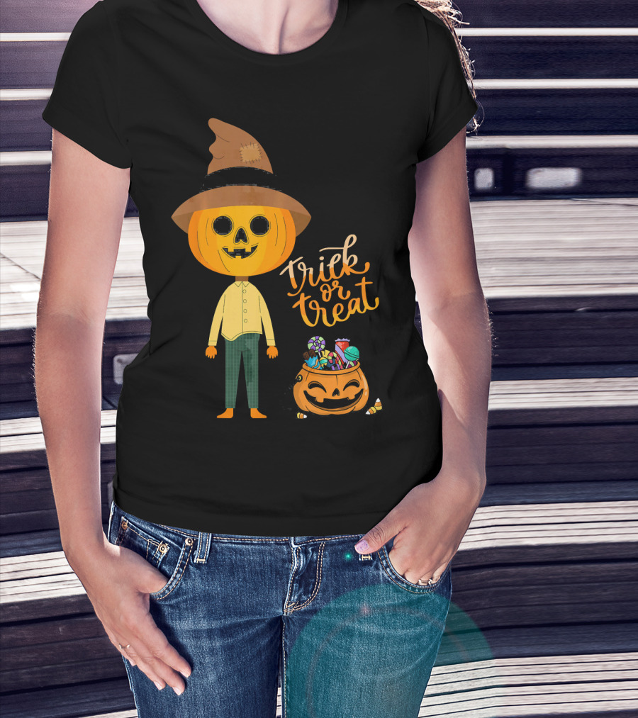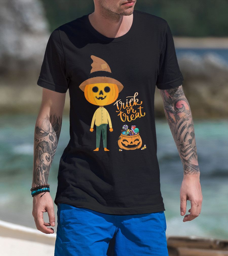 The Trick or Treat Funny Cute Halloween Pumpkin with Candy and Patchwork Hat T-shirt is designed for everyday wear and a consistent fit. Fabric is pre-shrunk ring-spun cotton with durable stitching. See the size chart below for exact measurements.