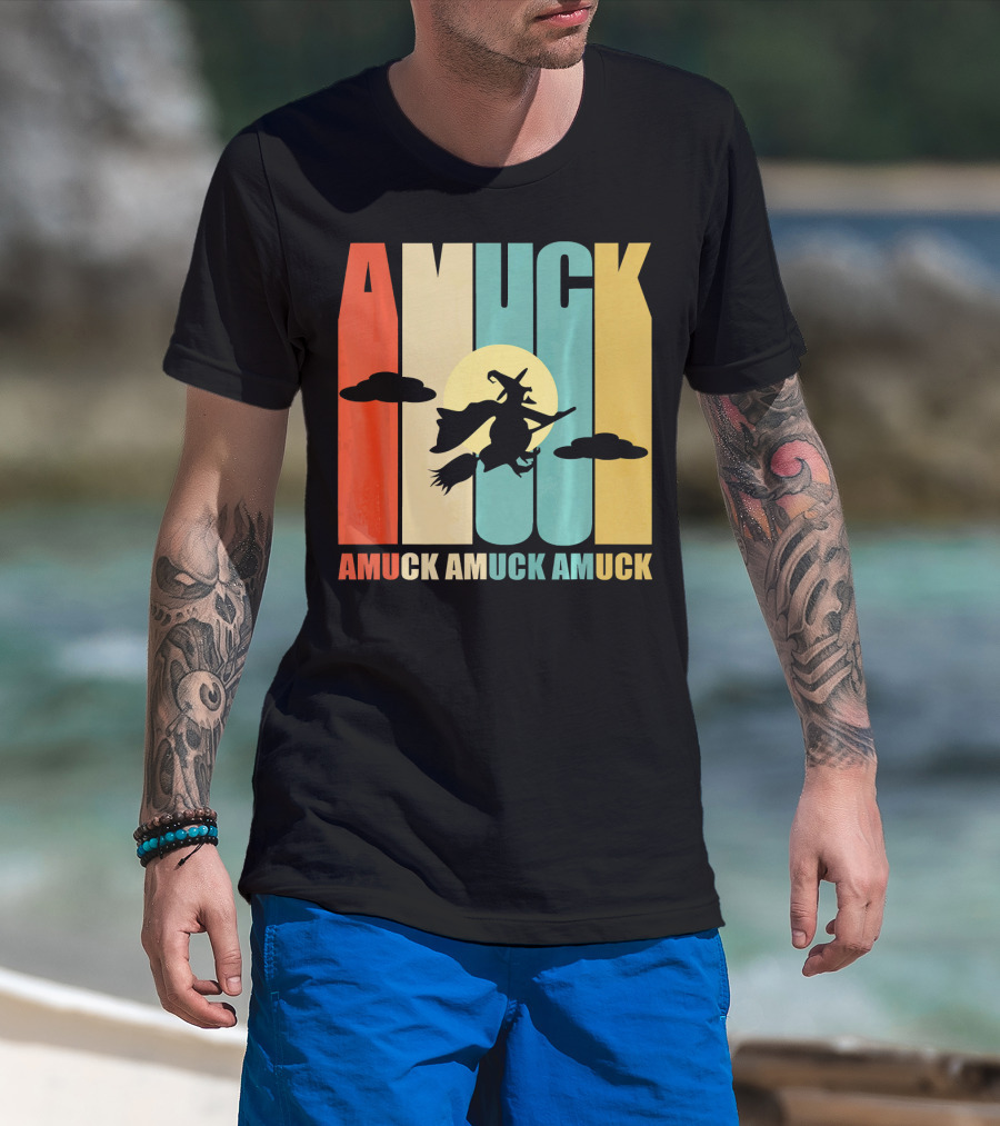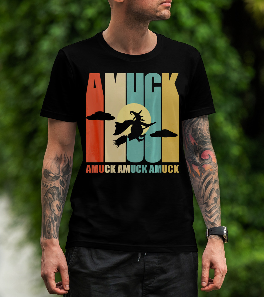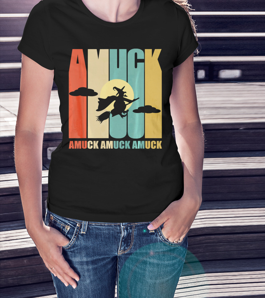 Amuck Amuck Amuck Vintage Witch On Broom Silhouette With Sunset Background T-Shirt