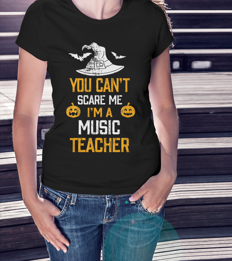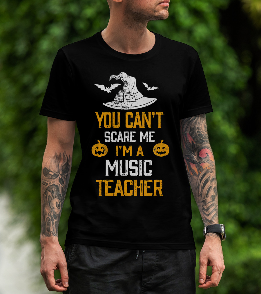 You Can't Scare Me I'm A Music Teacher Witch Hat Bats Pumpkins T-Shirt